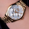 Женские наручные часы Slazenger SL.09.1990.4.04 сочетают в себе элегантный дизайн и практичность современных технологий. Модель обладает круглым корпусом диаметром 34 мм, изготовленным из суперметалла с IP-покрытиемIP-покрытиеМетод ионного напыления. Демонстрирует повышенную устойчивость к истиранию, окислению и химическим веществам. Под воздействием высокого давления и температуры около 1500°C молекулы металла надёжно соединяются с частицами корпуса часов., что обеспечивает высокую устойчивость к внешним воздействиям. Интегрированный браслет на пять звеньев выполнен из того же материала на раскладной застёжкеРаскладная застёжкаТакой тип застёжки используется только на браслетах из металла. Она никогда не раскрывается полностью, происходит разделение на 2 и более частей. Раскладывающая застёжка снизит вероятность потери часов к минимуму., гарантирующей комфортное ношение. Перламутровый циферблат оснащен индексами для лучшей читаемости времени и дополнен функцией отображения даты. Для защиты применяется минеральное стеклоМинеральное стеклоМинеральное стекло представляет собой искусственно выращенный минерал кварца. Такое стекло отличается особой устойчивостью к повреждениям и царапинам. Уступает по некоторым качествам сапфировому стеклу., обеспечивающее прочную защиту от царапин. Часы работают на японском кварцевом механизме, который питается от батарейки и гарантирует точное время без необходимости подзаводки. Водонепроницаемость составляет 3 атмосферы (30 метров), что позволяет использовать их в повседневной жизни, но не рекомендуется для плавания или занятий водными видами спорта.