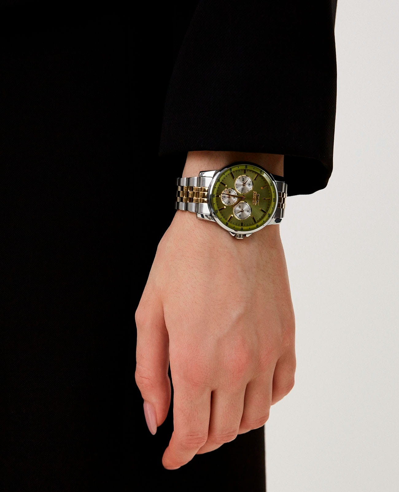 Женские наручные часы Slazenger SL.09.2009.4.09 представляют собой элегантное сочетание классического дизайна и функциональности современных технологий. Модель обладает круглым корпусом диаметром 36 мм, изготовленным из металлического сплава с IP-покрытиемIP-покрытиеМетод ионного напыления. Демонстрирует повышенную устойчивость к истиранию, окислению и химическим веществам. Под воздействием высокого давления и температуры около 1500°C молекулы металла надёжно соединяются с частицами корпуса часов., что обеспечивает высокую устойчивость к внешним воздействиям и привлекательный внешний вид. Интегрированный браслет на 5 звеньев с раскладной замокРаскладной замокДанный вариант застежки используется только на часах с металлическим браслетом. Отличительная особенность такого крепления в том, что длина браслета становится универсальной и вы можете самостоятельно отрегулировать нужный вам размер – застежка просто двигается по браслету часов. гарантирует комфортное ношение и безопасность . Зеленый циферблат дополнен тремя малыми циферблатами для отображения даты, дня недели и времени в формате 24 часа, а также защищен прочным минеральным стекломМинеральное стеклоМинеральное стекло представляет собой искусственно выращенный минерал кварца. Такое стекло отличается особой устойчивостью к повреждениям и царапинам. Уступает по некоторым качествам сапфировому стеклу.. Часы работают на кварцевом механизме, обеспечивающем точное время без необходимости подзаводки. Водонепроницаемость достигает 3 атмосфер (WR30), что позволяет использовать их в повседневной жизни, но не рекомендуется для плавания или водных видов спорта.