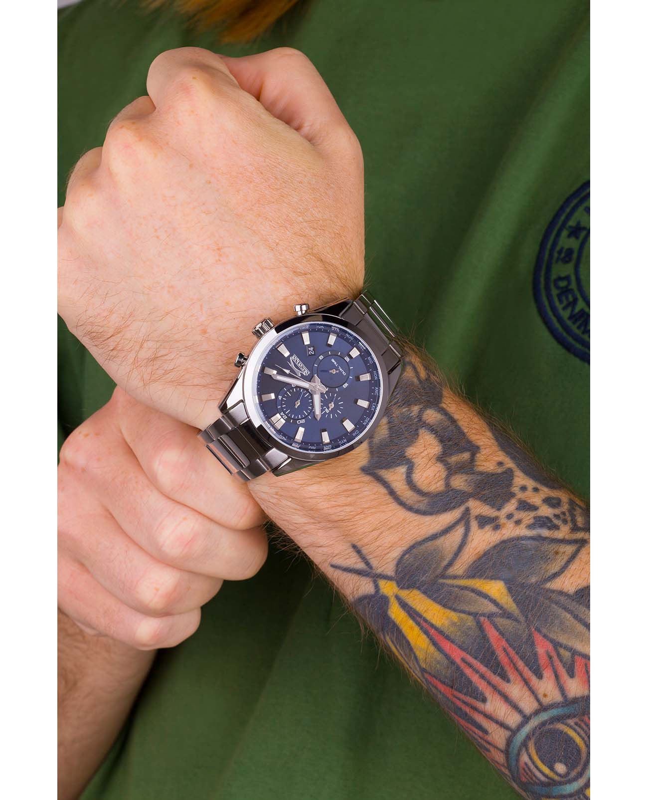 Циферблат тёмно-синего цвета декорирован стрелками с люминесцентным покрытиемЛюминесцентное покрытиеПозволяет считывать показания времени в темноте. Производители наносят на стрелки, часовые индексы, безель или поверхность циферблата светонакопительный состав, дающий холодное свечение., которые обеспечивают читаемость времени даже в условиях недостаточной освещенности. Для защиты используется минеральное стеклоМинеральное стеклоМинеральное стекло представляет собой искусственно выращенный минерал кварца. Такое стекло отличается особой устойчивостью к повреждениям и царапинам. Уступает по некоторым качествам сапфировому стеклу., обеспечивающее прочную защиту от царапин.