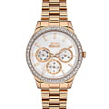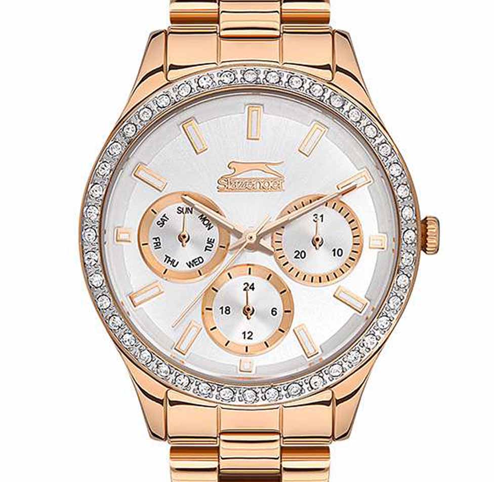 Женские наручные часы Slazenger SL.09.2069.4.04 сочетают в себе классический дизайн и высокое качество исполнения. Модель обладает круглым корпусом диаметром 34 мм, изготовленным из суперметалла IP-покрытиемIP-покрытиеМетод ионного напыления. Демонстрирует повышенную устойчивость к истиранию, окислению и химическим веществам. Под воздействием высокого давления и температуры около 1500°C молекулы металла надёжно соединяются с частицами корпуса часов. цвета розового золота, что обеспечивает устойчивость к внешним воздействиям. Браслет выполнен из суперметалла с IP-покрытиемIP-покрытиеМетод ионного напыления. Демонстрирует повышенную устойчивость к истиранию, окислению и химическим веществам. Под воздействием высокого давления и температуры около 1500°C молекулы металла надёжно соединяются с частицами корпуса часов. на раскладной застёжкеРаскладная застёжкаТакой тип застёжки используется только на браслетах из металла. Она никогда не раскрывается полностью, происходит разделение на 2 и более частей. Раскладывающая застёжка снизит вероятность потери часов к минимуму.. Неподвижный безельБезельВнешний ободок, закрепляющий стекло. В спортивных часах так называется поворотное кольцо с делениями на циферблате, выполняет роль таймера – замеряет отрезки времени на шкале. Неподвижный безель – элемент декора. Однонаправленно вращающийся безель на дайверских часах позволяет фиксировать моменты погружения и выныривания на поверхность. из суперметалла с IP-покрытиемIP-покрытиеМетод ионного напыления. Демонстрирует повышенную устойчивость к истиранию, окислению и химическим веществам. Под воздействием высокого давления и температуры около 1500°C молекулы металла надёжно соединяются с частицами корпуса часов. украшен кристаллами. Перламутровый циферблат оформлен логотипом бренда и метками времени. Имеются дополнительные малые циферблаты для отображения даты, дня недели и текущего времени в 24-часовом формате. Для защиты используется минеральное стеклоМинеральное стеклоМинеральное стекло представляет собой искусственно выращенный минерал кварца. Такое стекло отличается особой устойчивостью к повреждениям и царапинам. Уступает по некоторым качествам сапфировому стеклу., обеспечивающее прочную защиту от царапин. Стрелки и метки имеют люминесцентное покрытиеЛюминесцентное покрытиеПозволяет считывать показания времени в темноте. Производители наносят на стрелки, часовые индексы, безель или поверхность циферблата светонакопительный состав, дающий холодное свечение., что позволяет легко читать время в темноте. Часы работают на японском кварцевом механизме, который обеспечивает точность хода без необходимости подзаводки. Водонепроницаемость часов составляет 3 атмосферы (WR30), что позволяет защитить корпус от случайных брызг или капель дождя.
