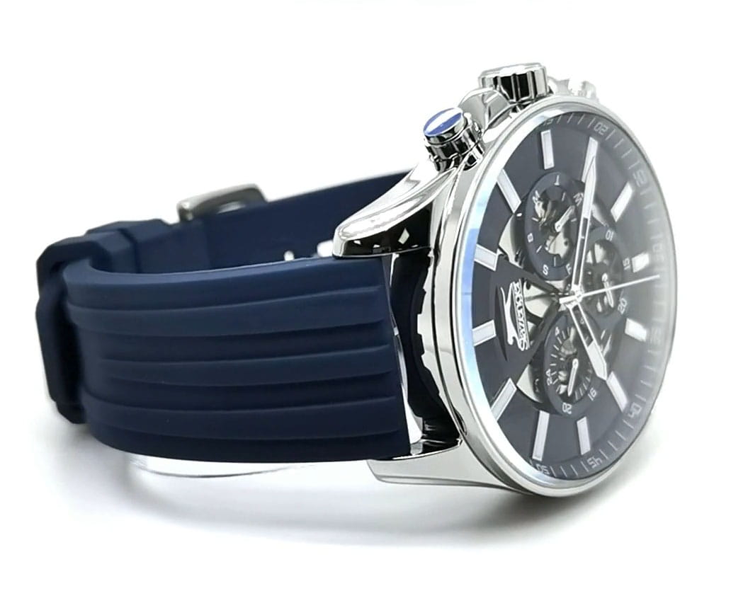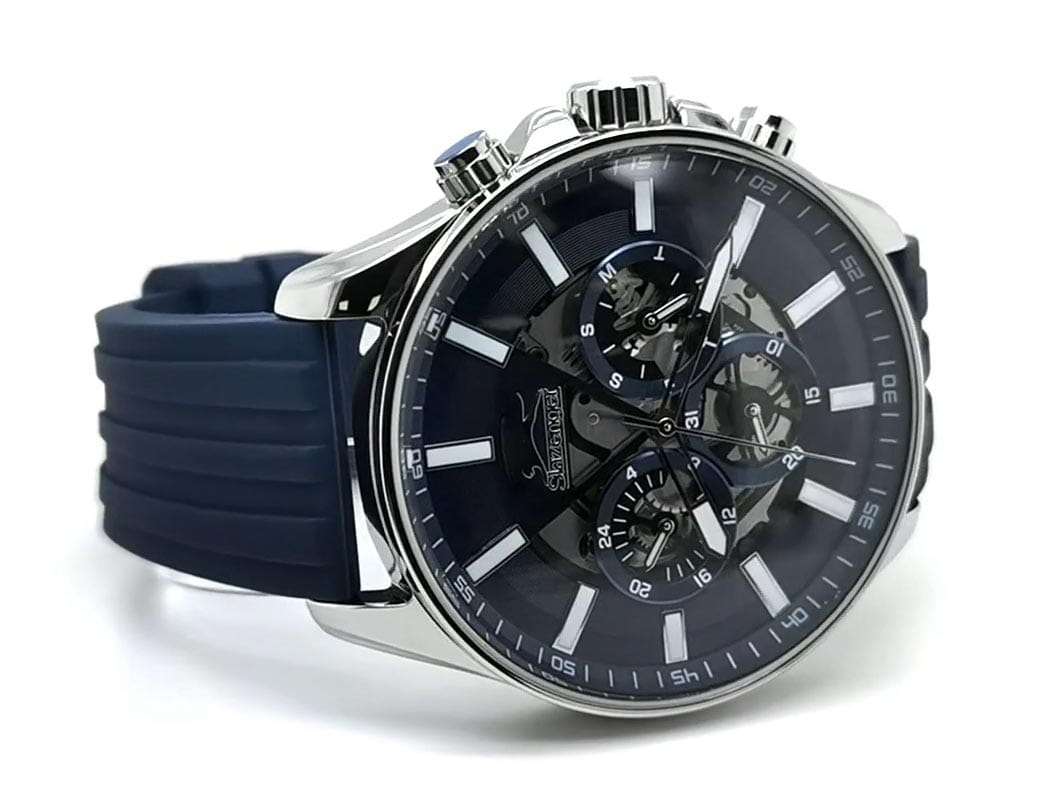 Часы Slazenger SL.09.2127.2.02 воплощают в себе элегантность и практичность, идеально подходящие для современных мужчин. Их синий циферблат, защищенный минеральным стекломМинеральное стеклоМинеральное стекло представляет собой искусственно выращенный минерал кварца. Такое стекло отличается особой устойчивостью к повреждениям и царапинам. Уступает по некоторым качествам сапфировому стеклу., заключен в серебристый корпус диаметром 47 мм, который изготовлен из прочного суперметалла. Надежный кварцевый механизм обеспечивает точность, а водозащита 5 ATM делает их устойчивыми к воздействию воды. Силиконовый браслет с классической застежкой - очень комфортно сидит на запястье. Часы оснащены 24-часовым указателем времени, а также функциями отображения даты и дня недели на дополнительных малых циферблатах. Люминесцентное покрытиеЛюминесцентное покрытиеПозволяет считывать показания времени в темноте. Производители наносят на стрелки, часовые индексы, безель или поверхность циферблата светонакопительный состав, дающий холодное свечение. на стрелках и метках обеспечивает отличную видимость в темноте.