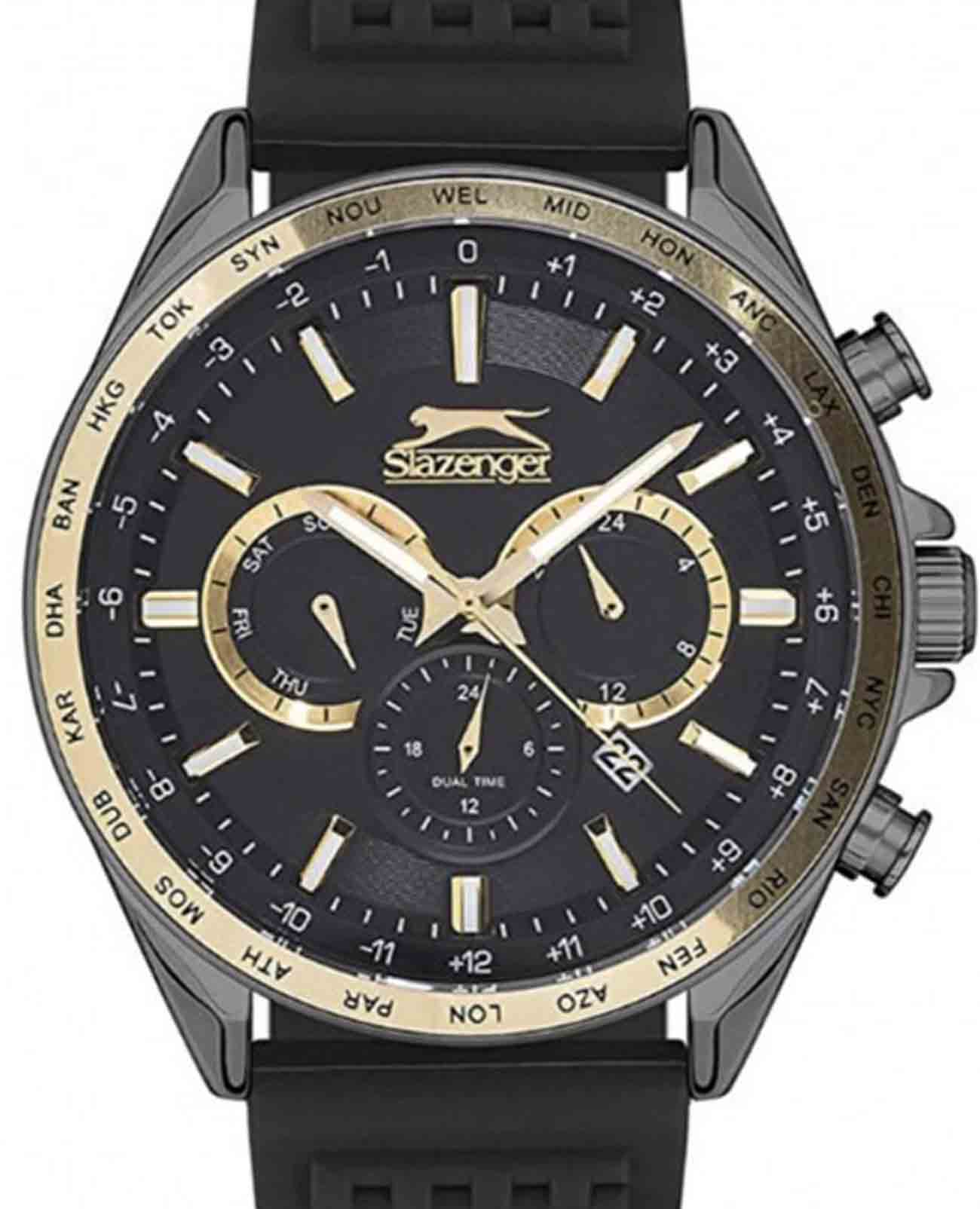 Мужские наручные часы Slazenger SL.09.2179.2.05 — стильный аксессуар с ярко выраженными спортивными чертами, который станет надежным спутником в повседневной жизни. Эти часы оснащены кварцевым механизмом, обеспечивающим высокую точность хода. Металлический корпус с черным IP-покрытиемIP-покрытиеМетод ионного напыления. Демонстрирует повышенную устойчивость к истиранию, окислению и химическим веществам. Под воздействием высокого давления и температуры около 1500°C молекулы металла надёжно соединяются с частицами корпуса часов. в сочетании с черным силиконовый ремешком на классической застежке шириной 22 мм создает гармоничный и современный образ. Диаметр корпуса составляет 45 мм, а толщина — 11 мм, что придает часам стильный и выразительный вид. БезельБезельВнешний ободок, закрепляющий стекло. В спортивных часах так называется поворотное кольцо с делениями на циферблате, выполняет роль таймера – замеряет отрезки времени на шкале. Неподвижный безель – элемент декора. Однонаправленно вращающийся безель на дайверских часах позволяет фиксировать моменты погружения и выныривания на поверхность. с золотистым IP-покрытиемIP-покрытиеМетод ионного напыления. Демонстрирует повышенную устойчивость к истиранию, окислению и химическим веществам. Под воздействием высокого давления и температуры около 1500°C молекулы металла надёжно соединяются с частицами корпуса часов., что придает ему дополнительную прочность и устойчивость к износу. Минеральное стеклоМинеральное стеклоМинеральное стекло представляет собой искусственно выращенный минерал кварца. Такое стекло отличается особой устойчивостью к повреждениям и царапинам. Уступает по некоторым качествам сапфировому стеклу. защищает циферблат от царапин и внешних воздействий, а водозащита уровня WR 50 позволяет не беспокоиться о случайных контактах с водой, будь то дождь или мытье рук. Особенностью данной модели является наличие календаря, отображающего дату и день недели, а также возможность следить за временем во втором часовом поясе. Люминесцентное покрытиеЛюминесцентное покрытиеПозволяет считывать показания времени в темноте. Производители наносят на стрелки, часовые индексы, безель или поверхность циферблата светонакопительный состав, дающий холодное свечение. на стрелках и метках обеспечивает отличную видимость в темноте.