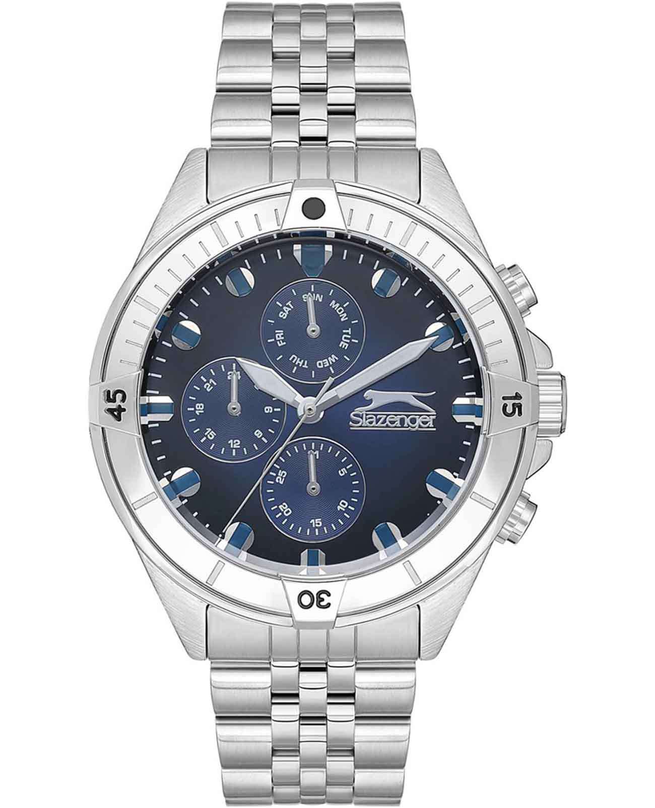 Часы Slazenger SL.09.2227.2.02 — это стильная и функциональная модель, созданная для современных мужчин, ценящих качество и надежность. Корпус из прочного металла и безельБезельВнешний ободок, закрепляющий стекло. В спортивных часах так называется поворотное кольцо с делениями на циферблате, выполняет роль таймера – замеряет отрезки времени на шкале. Неподвижный безель – элемент декора. Однонаправленно вращающийся безель на дайверских часах позволяет фиксировать моменты погружения и выныривания на поверхность. диаметром 46 мм и толщиной 12 мм придаёт часам солидный вид, а серебристый металлический браслет с раскладной застёжкойРаскладная застёжкаТакой тип застёжки используется только на браслетах из металла. Она никогда не раскрывается полностью, происходит разделение на 2 и более частей. Раскладывающая застёжка снизит вероятность потери часов к минимуму. обеспечивает удобство при ношении. Надежный кварцевый механизм гарантирует точность хода, а минеральное стеклоМинеральное стеклоМинеральное стекло представляет собой искусственно выращенный минерал кварца. Такое стекло отличается особой устойчивостью к повреждениям и царапинам. Уступает по некоторым качествам сапфировому стеклу. защищает градиентный синий циферблат от царапин. Модель оснащена дополнительными малыми циферблатами, отображающими дату, день недели и текущее время в 24-часовом формате, что делает часы особенно практичными. Для удобства использования в темное время суток предусмотрено люминесцентное покрытиеЛюминесцентное покрытиеПозволяет считывать показания времени в темноте. Производители наносят на стрелки, часовые индексы, безель или поверхность циферблата светонакопительный состав, дающий холодное свечение. стрелок. Заводная головка имеет специальную защиту. Водозащита уровня WR 50 позволяет не беспокоиться о случайном попадании воды. Вес изделия составляет 161 грамм. Эти часы станут отличным выбором для тех, кто ценит элегантность и функциональность в одном аксессуаре.