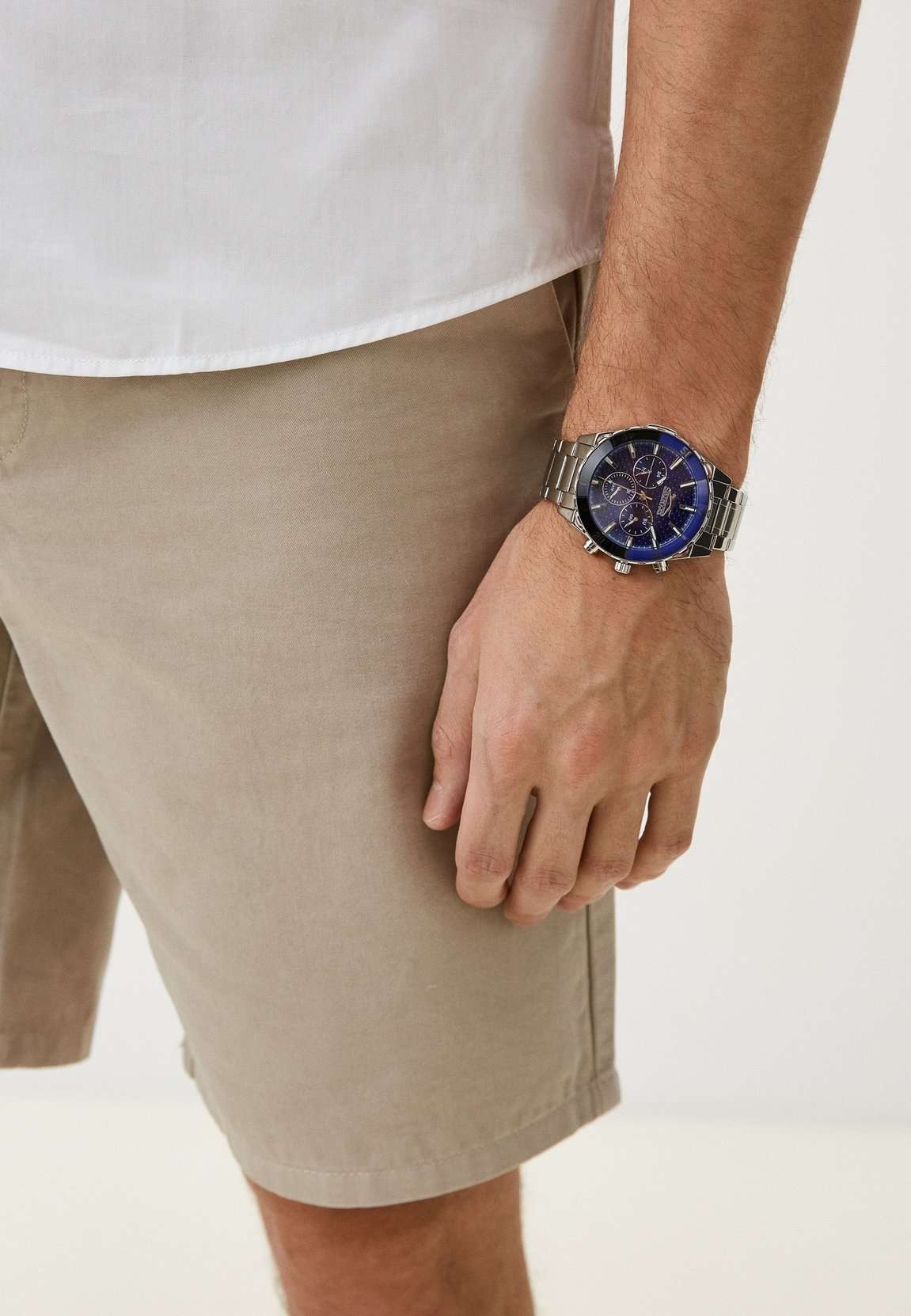 Часы Slazenger SL.09.2236.2.06 — это стильная и надежная модель, которая станет отличным выбором для активного современного мужчины. Крупный корпус диаметром 46 мм выполнен из прочного металла, а серебристый металлический браслет оснащён удобной раскладной застёжкойРаскладная застёжкаТакой тип застёжки используется только на браслетах из металла. Она никогда не раскрывается полностью, происходит разделение на 2 и более частей. Раскладывающая застёжка снизит вероятность потери часов к минимуму., что обеспечивает комфорт при повседневном ношении. На безельБезельВнешний ободок, закрепляющий стекло. В спортивных часах так называется поворотное кольцо с делениями на циферблате, выполняет роль таймера – замеряет отрезки времени на шкале. Неподвижный безель – элемент декора. Однонаправленно вращающийся безель на дайверских часах позволяет фиксировать моменты погружения и выныривания на поверхность. нанесено черное и синее IP-покрытиеIP-покрытиеМетод ионного напыления. Демонстрирует повышенную устойчивость к истиранию, окислению и химическим веществам. Под воздействием высокого давления и температуры около 1500°C молекулы металла надёжно соединяются с частицами корпуса часов.. Минеральное стеклоМинеральное стеклоМинеральное стекло представляет собой искусственно выращенный минерал кварца. Такое стекло отличается особой устойчивостью к повреждениям и царапинам. Уступает по некоторым качествам сапфировому стеклу. защищает текстурированный синий циферблат от случайных царапин, а водозащита уровня WR 50 позволяет не переживать о попадании влаги при контакте с водой. На циферблате расположены дополнительные малые циферблаты с отображением даты, дня недели и времени в 24-часовом формате, что делает использование часов максимально функциональным. Для удобства использования в темное время суток предусмотрено люминесцентное покрытиеЛюминесцентное покрытиеПозволяет считывать показания времени в темноте. Производители наносят на стрелки, часовые индексы, безель или поверхность циферблата светонакопительный состав, дающий холодное свечение. стрелок. Толщина корпуса составляет 13 мм, вес часов — 152 грамма.