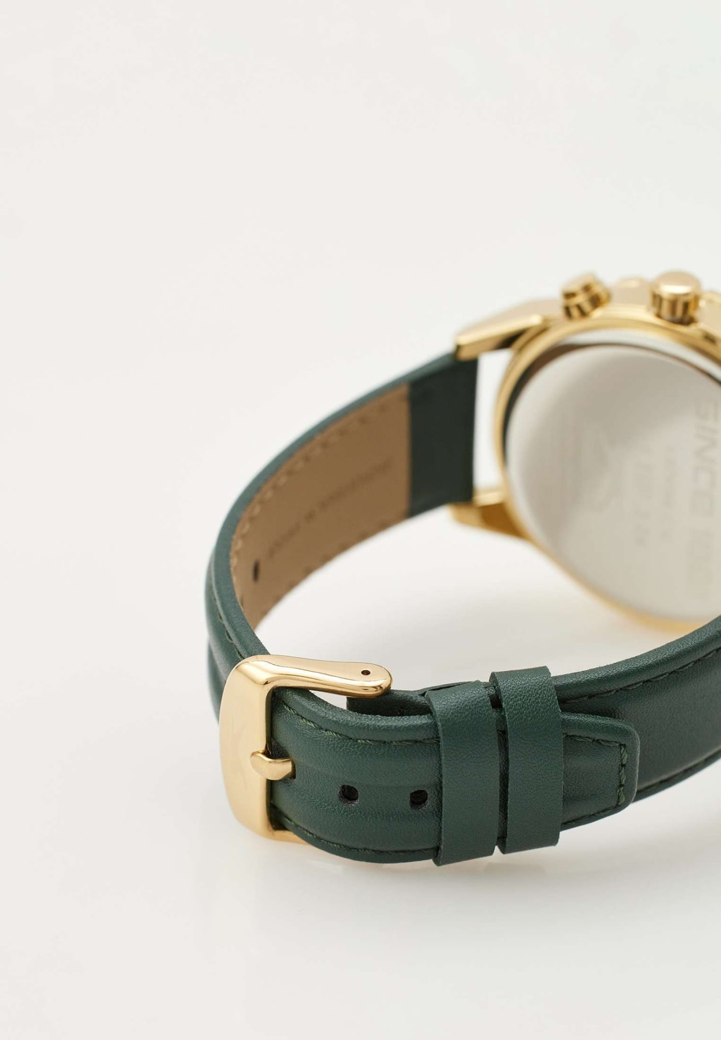 Часы Slazenger SL.09.2237.2.04 — это стильная и надежная модель, которая станет отличным выбором для активного современного мужчины. Крупный корпус диаметром 46 мм выполнен из прочного металла с золотистым IP-покрытиемIP-покрытиеМетод ионного напыления. Демонстрирует повышенную устойчивость к истиранию, окислению и химическим веществам. Под воздействием высокого давления и температуры около 1500°C молекулы металла надёжно соединяются с частицами корпуса часов., а зеленый кожаный ремешок с классической застежкой, что обеспечивает комфорт при повседневном ношении. На безельБезельВнешний ободок, закрепляющий стекло. В спортивных часах так называется поворотное кольцо с делениями на циферблате, выполняет роль таймера – замеряет отрезки времени на шкале. Неподвижный безель – элемент декора. Однонаправленно вращающийся безель на дайверских часах позволяет фиксировать моменты погружения и выныривания на поверхность. нанесено черное и зеленое IP-покрытиеIP-покрытиеМетод ионного напыления. Демонстрирует повышенную устойчивость к истиранию, окислению и химическим веществам. Под воздействием высокого давления и температуры около 1500°C молекулы металла надёжно соединяются с частицами корпуса часов.. Минеральное стеклоМинеральное стеклоМинеральное стекло представляет собой искусственно выращенный минерал кварца. Такое стекло отличается особой устойчивостью к повреждениям и царапинам. Уступает по некоторым качествам сапфировому стеклу. защищает текстурированный синий циферблат от случайных царапин, а водозащита уровня WR 50 позволяет не переживать о попадании влаги при контакте с водой. На циферблате расположены дополнительные малые циферблаты с отображением даты, дня недели и времени в 24-часовом формате, что делает использование часов максимально функциональным. Для удобства использования в темное время суток предусмотрено люминесцентное покрытиеЛюминесцентное покрытиеПозволяет считывать показания времени в темноте. Производители наносят на стрелки, часовые индексы, безель или поверхность циферблата светонакопительный состав, дающий холодное свечение. стрелок. Толщина корпуса составляет 12 мм, вес часов — 76 грамма.