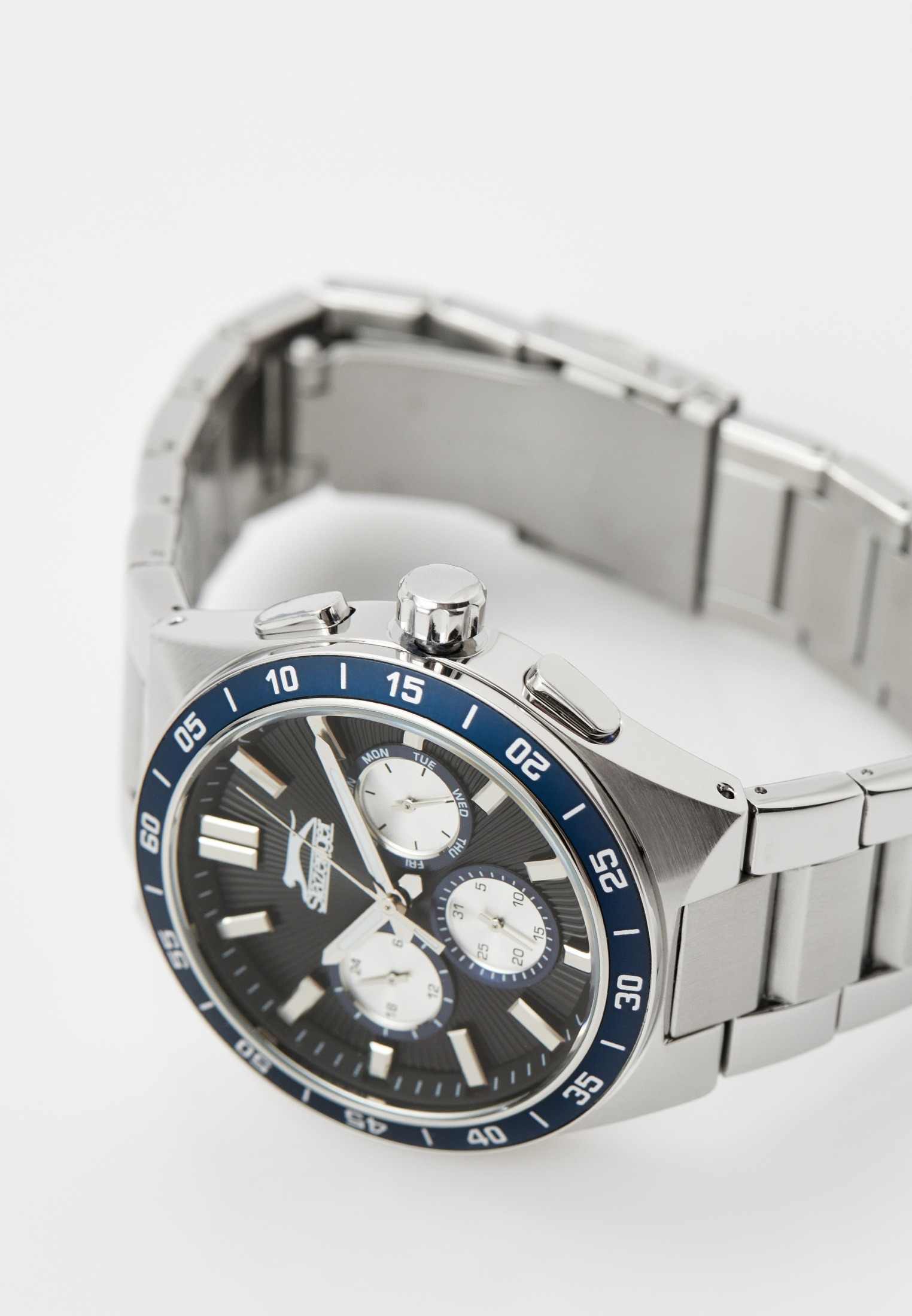 Часы Slazenger SL.09.2285.2.01 — это стильное решение для тех, кто ценит сочетание выразительного дизайна и функциональности. Модель оснащена надежным кварцевым механизмом, который заключен в прочный корпус диаметром 45 мм и толщиной 13 мм, выполненный из суперметалла — современного сплава на основе меди с пониженным содержанием цинка и никеля, обладающего высокой прочностью и устойчивостью к износу, а на безельБезельВнешний ободок, закрепляющий стекло. В спортивных часах так называется поворотное кольцо с делениями на циферблате, выполняет роль таймера – замеряет отрезки времени на шкале. Неподвижный безель – элемент декора. Однонаправленно вращающийся безель на дайверских часах позволяет фиксировать моменты погружения и выныривания на поверхность. нанесено синее IP-покрытиеIP-покрытиеМетод ионного напыления. Демонстрирует повышенную устойчивость к истиранию, окислению и химическим веществам. Под воздействием высокого давления и температуры около 1500°C молекулы металла надёжно соединяются с частицами корпуса часов. и секундная шкала. Минеральное стеклоМинеральное стеклоМинеральное стекло представляет собой искусственно выращенный минерал кварца. Такое стекло отличается особой устойчивостью к повреждениям и царапинам. Уступает по некоторым качествам сапфировому стеклу. защищает черный циферблат от царапин и повреждений. Часы оснащены дополнительными циферблатами для отображения 24-часового времени, даты и дня недели, что делает использование еще более удобным. Браслет также выполнен из суперметалла с раскладной застёжкойРаскладная застёжкаТакой тип застёжки используется только на браслетах из металла. Она никогда не раскрывается полностью, происходит разделение на 2 и более частей. Раскладывающая застёжка снизит вероятность потери часов к минимуму. и гармонично дополняет общий облик аксессуара. Циферблат оснащён люминесцентным покрытиемЛюминесцентное покрытиеПозволяет считывать показания времени в темноте. Производители наносят на стрелки, часовые индексы, безель или поверхность циферблата светонакопительный состав, дающий холодное свечение. стрелок и меток, что позволяет легко определять время даже в условиях плохой освещенности. Класс водозащиты 5 АТМ позволяет не бояться случайных брызг и дождя, а гарантия 12 месяцев подтверждает высокое качество изделия.