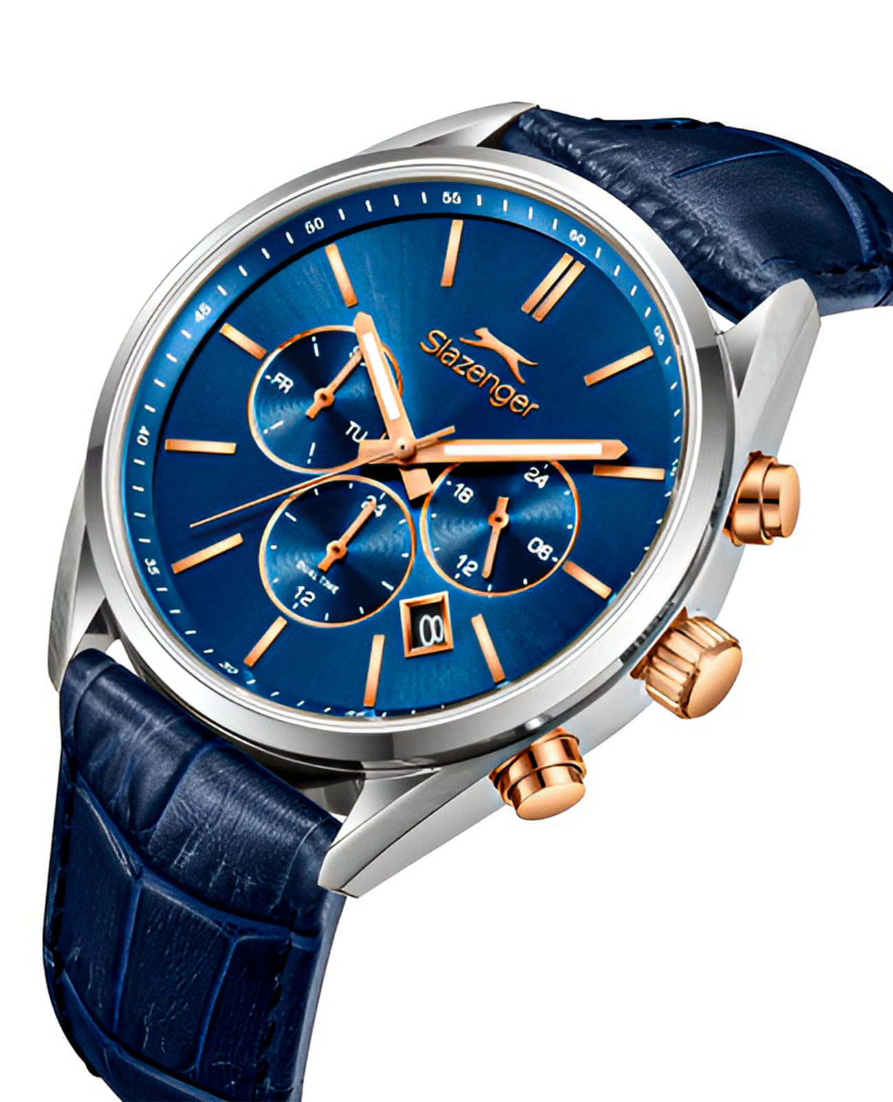 Мужские кварцевые часы Slazenger — это выразительный и функциональный аксессуар. Корпус диаметром 42 мм и толщиной 12 мм выполнен из нержавеющей стали 316L. Циферблат синего цвета оформлен индексами и стрелками. Циферблат защищён минеральным стекломМинеральное стеклоМинеральное стекло представляет собой искусственно выращенный минерал кварца. Такое стекло отличается особой устойчивостью к повреждениям и царапинам. Уступает по некоторым качествам сапфировому стеклу.. Механизм — кварцевый. Часы оснащены индикацией дня недели, даты, 12/24-часового формата времени и функцией второго часового пояса (GMT)Второй часовой поясФункция, позволяющая отображать время двух часовых поясов одновременно.. Окошко даты расположено между 4 и 5 часами. Стрелки и метки с люминесцентным покрытиемЛюминесцентное покрытиеПозволяет считывать показания времени в темноте. Производители наносят на стрелки, часовые индексы, безель или поверхность циферблата светонакопительный состав, дающий холодное свечение., обеспечивающим хорошую читаемость в темноте. Часы оснащены кожаным ремешком с стандартной застёжкой. Водонепроницаемость 100 м позволяет использовать часы для плавания и повседневного ношения. Гарантия — 12 месяцев. Идеальный выбор для тех, кто ценит стиль, функциональность и качество.