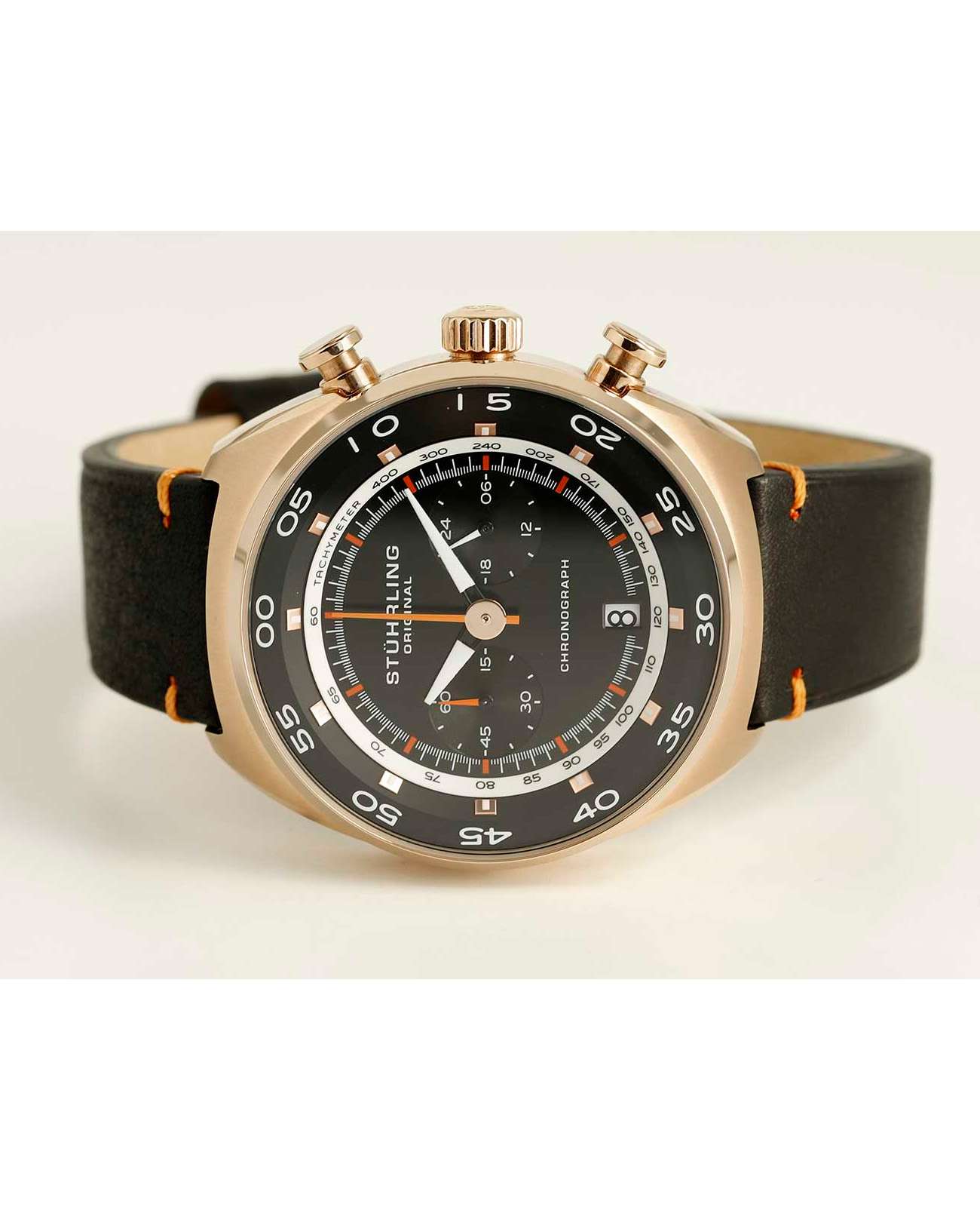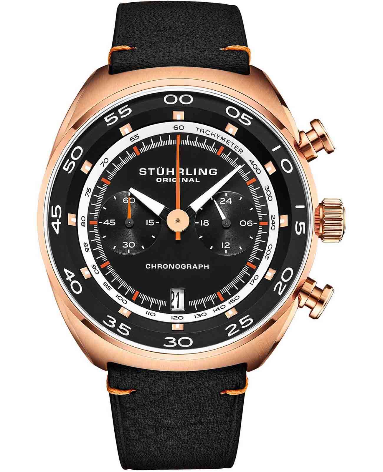 Мужские наручные часы-хронографХронографФункция позволяет измерять отрезки времени с особой точностью: часы, минуты, секунды. Верным признаком хронографа является наличие на циферблате 3 дополнительных окошек-счётчиков. Stuhrling 1000.03 из коллекции Monaco сочетают в себе спортивный дизайн и функциональность, необходимую для активного образа жизни . Модель обладает круглым корпусом, изготовленным из нержавеющей стали с PVD-покрытиемPVDУльтратонкое покрытие наносится в технике вакуумного напыления, сочетает в себе нитрид титана особой прочности со слоем золота или оксида хрома. Несёт в себе декоративную или защитную функцию., что обеспечивает высокую устойчивость к внешним воздействиям. Циферблат оснащен накладными метками в виде штрихов и окном даты в положении «6 часов», что добавляет практичности в ежедневном использовании . Для защиты циферблата используется стекло KrysternaKrysternaKrysterna — инновационное стекло для наручных часов. Благодаря уникальной структуре, Krysterna объединяет ключевые преимущества двух материалов: твердость сапфира, защищающую от царапин, и гибкость минерального стекла, обеспечивающую устойчивость к деформациям. Такая комбинация делает его идеальным решением для часов, подверженных экстремальным нагрузкам, сохраняя при этом оптическую прозрачность., которое надежно защищает от царапин и механических повреждений. Часы оснащены функцией секундомераСекундомерСекундоме́р — прибор, способный измерять интервалы времени с точностью до долей секунды., позволяющей измерять короткие промежутки времени с точностью . Стрелки с люминесцентным покрытиемЛюминесцентное покрытиеПозволяет считывать показания времени в темноте. Производители наносят на стрелки, часовые индексы, безель или поверхность циферблата светонакопительный состав, дающий холодное свечение.. Ремешок выполнен из кожи с классической застежкой, гарантирующей комфортное ношение . Кварцевый механизм обеспечивает высокую точность хода без необходимости подзаводки, что делает использование часов максимально удобным . Водонепроницаемость модели достигает 5 атмосфер (50 метров), что позволяет использовать их в повседневной жизни, однако они не предназначены для плавания или дайвинга . Спортивный дизайн и широкий функционал делают эти часы универсальным аксессуаром для активных людей.