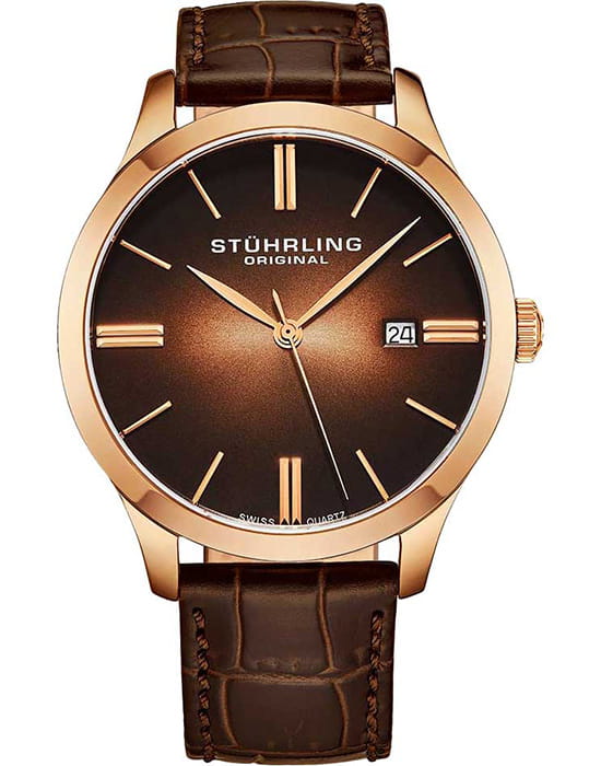 Stuhrling 4014.3 — элегантные мужские часы, объединяющие строгую классику и современную функциональность. Корпус из нержавеющей стали с PVD-покрытиемPVDУльтратонкое покрытие наносится в технике вакуумного напыления, сочетает в себе нитрид титана особой прочности со слоем золота или оксида хрома. Несёт в себе декоративную или защитную функцию. создают ощущение монолитной надёжности, а глубокий циферблат с вертикальной текстурой придаёт модели выразительность и характер. Кожаный ремешок на стандартной застежке обеспечивает комфорт. Крупные метки и стрелки обеспечивают идеальную читаемость. На позиции «3 часов» расположено аккуратное окно даты, подчёркивающее симметрию дизайна. Прочное стекло Krysterna защищает циферблат от царапин, а надёжный кварцевый механизм гарантирует стабильную точность. Stuhrling — выбор уверенного мужчины, ценящего сочетание функциональности, лаконичного дизайна и безупречной отделки.