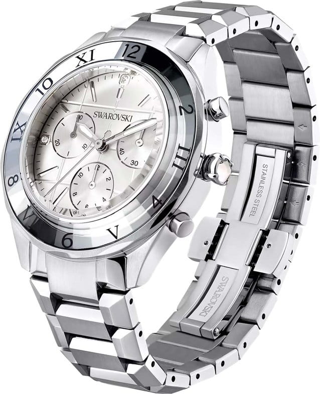 Часы Swarovski 5641297 представляют собой гармоничное сочетание современного стиля и функциональности, идеально подходящее для тех, кто ценит элегантные аксессуары. Эти швейцарские кварцевые часы с хронографомХронографФункция позволяет измерять отрезки времени с особой точностью: часы, минуты, секунды. Верным признаком хронографа является наличие на циферблате 3 дополнительных окошек-счётчиков. и секундомеромСекундомерСекундоме́р — прибор, способный измерять интервалы времени с точностью до долей секунды. заключены в прочный стальной корпус. Серебристый циферблат, украшенный кристаллами Swarovski и метками в виде штрихов, придает часам изысканный вид и подчеркивает их утонченность. Ограненный кристальный безельБезельВнешний ободок, закрепляющий стекло. В спортивных часах так называется поворотное кольцо с делениями на циферблате, выполняет роль таймера – замеряет отрезки времени на шкале. Неподвижный безель – элемент декора. Однонаправленно вращающийся безель на дайверских часах позволяет фиксировать моменты погружения и выныривания на поверхность. с римскими и арабскими цифрами добавляет оригинальности и делает часы не только стильными, но и удобными для считывания времени. Минеральное стеклоМинеральное стеклоМинеральное стекло представляет собой искусственно выращенный минерал кварца. Такое стекло отличается особой устойчивостью к повреждениям и царапинам. Уступает по некоторым качествам сапфировому стеклу. обеспечивает надежную защиту циферблата, а водозащита 50 WR позволяет не беспокоиться о случайных контактах с водой в повседневной жизни. Стальной браслет с застежкой «бабочка»Застёжка "бабочка"Такой вид застёжки дополняется предохранителями, помогающими избежать случайного раскрытия браслета. Обладают изящным исполнением. обеспечивает комфортное ношение и надежную фиксацию на запястье. Заводная головка, украшенная кристаллом круглой огранки, придает дополнительную изящность и завершенность общему виду. С диаметром корпуса 39 мм и длиной браслета 16 см, эти часы станут идеальным аксессуаром для тех, кто ценит качество, стиль и функциональность в одном изделии.