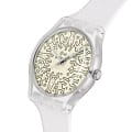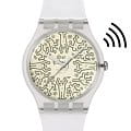 Часы Swatch SO29Z146-5300 —  стильный и удобный аксессуар. Часы поддерживают функцию бесконтактной оплаты SwatchPAY!. Матовый светло-бежевый циферблат этих часов украшен серыми рисунками, подписью и авторскими правами художника Кита Харинга, а также интерпретацией логотипа Swatch. Серебристые часовая, минутная и секундная стрелки защищены стеклом из биоматериала. Матовый прозрачный корпус из биоматериала, а также матовые прозрачные ремешок, петля и пряжка завершают дизайн этих часов. Ремешок силиконовый на стандартной застёжке. Внутри часов установлен надежный кварцевый механизм, который обеспечивает точность хода. Эти часы водонепроницаемы до 30 метров, что позволяет не беспокоиться о случайных брызгах или дождевых каплях. Swatch SO29Z146-5300 — это идеальный выбор для тех, кто ценит сочетание стиля, комфорта и функциональности в одном аксессуаре.
