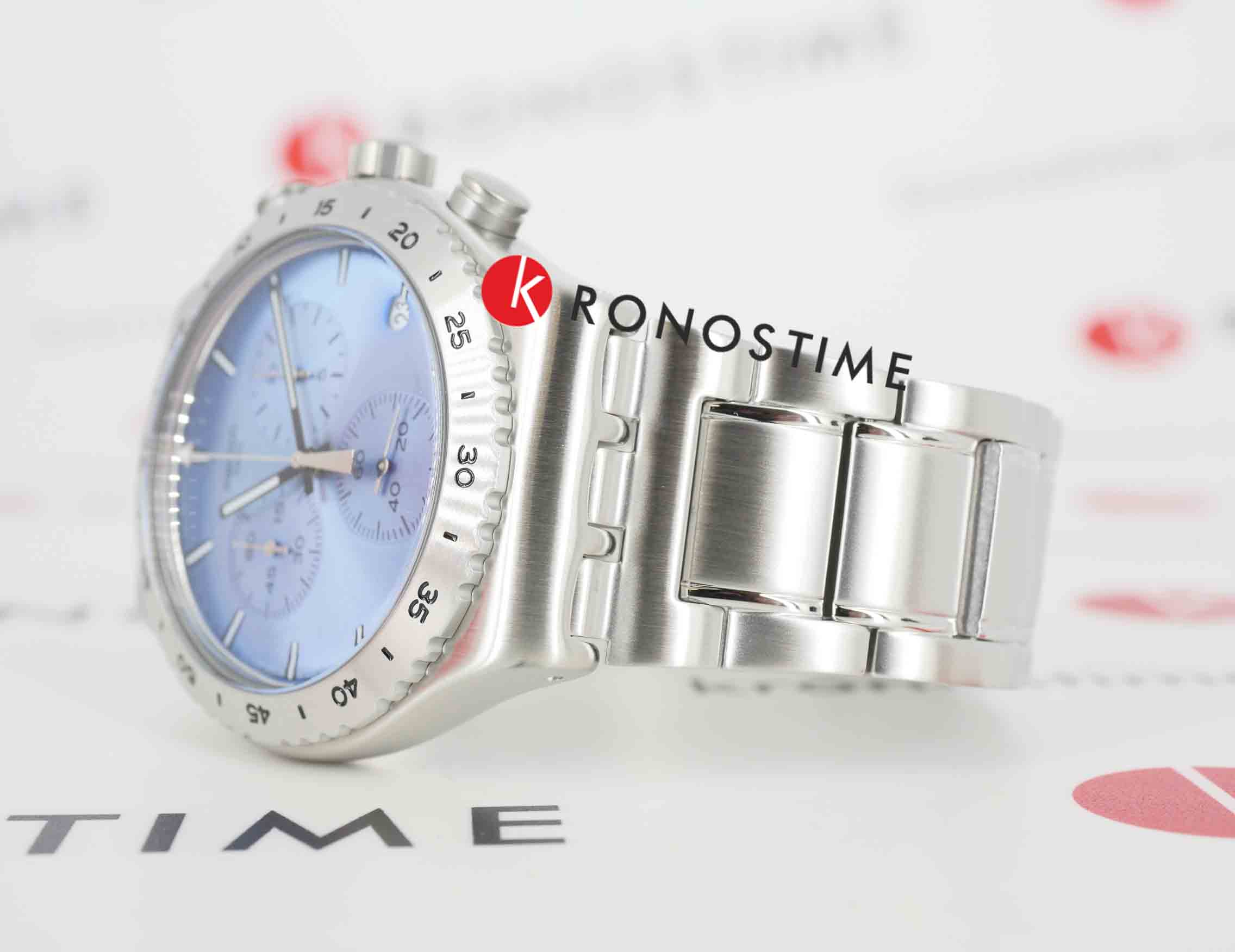 Часы Swatch YVS528G — это стильный и современный аксессуар для тех, кто ценит лёгкость и комфорт. Эта стильная модель часов из нержавеющей стали дополнена матовым металлическим браслетом из нержавеющей стали со съемными звеньями и застёжкой «бабочка»Застёжка "бабочка"Такой вид застёжки дополняется предохранителями, помогающими избежать случайного раскрытия браслета. Обладают изящным исполнением. . Голубой циферблат с радиальной полировкой оснащен хронографомХронографФункция позволяет измерять отрезки времени с особой точностью: часы, минуты, секунды. Верным признаком хронографа является наличие на циферблате 3 дополнительных окошек-счётчиков. и светящимися в темноте индексами и стрелками из-за люминесцентного покрытияЛюминесцентное покрытиеПозволяет считывать показания времени в темноте. Производители наносят на стрелки, часовые индексы, безель или поверхность циферблата светонакопительный состав, дающий холодное свечение. заключен в матовый корпус из нержавеющей стали. Завершают образ индикатор даты в положении «4 часа» на циферблате, а также черные цифры и индексы на безелеБезельВнешний ободок, закрепляющий стекло. В спортивных часах так называется поворотное кольцо с делениями на циферблате, выполняет роль таймера – замеряет отрезки времени на шкале. Неподвижный безель – элемент декора. Однонаправленно вращающийся безель на дайверских часах позволяет фиксировать моменты погружения и выныривания на поверхность. из нержавеющей стали. Водозащита 30 метров делает часы практичными для повседневного использования. Эти часы подойдут для повседневного ношения и станут ярким акцентом в вашем наряде.