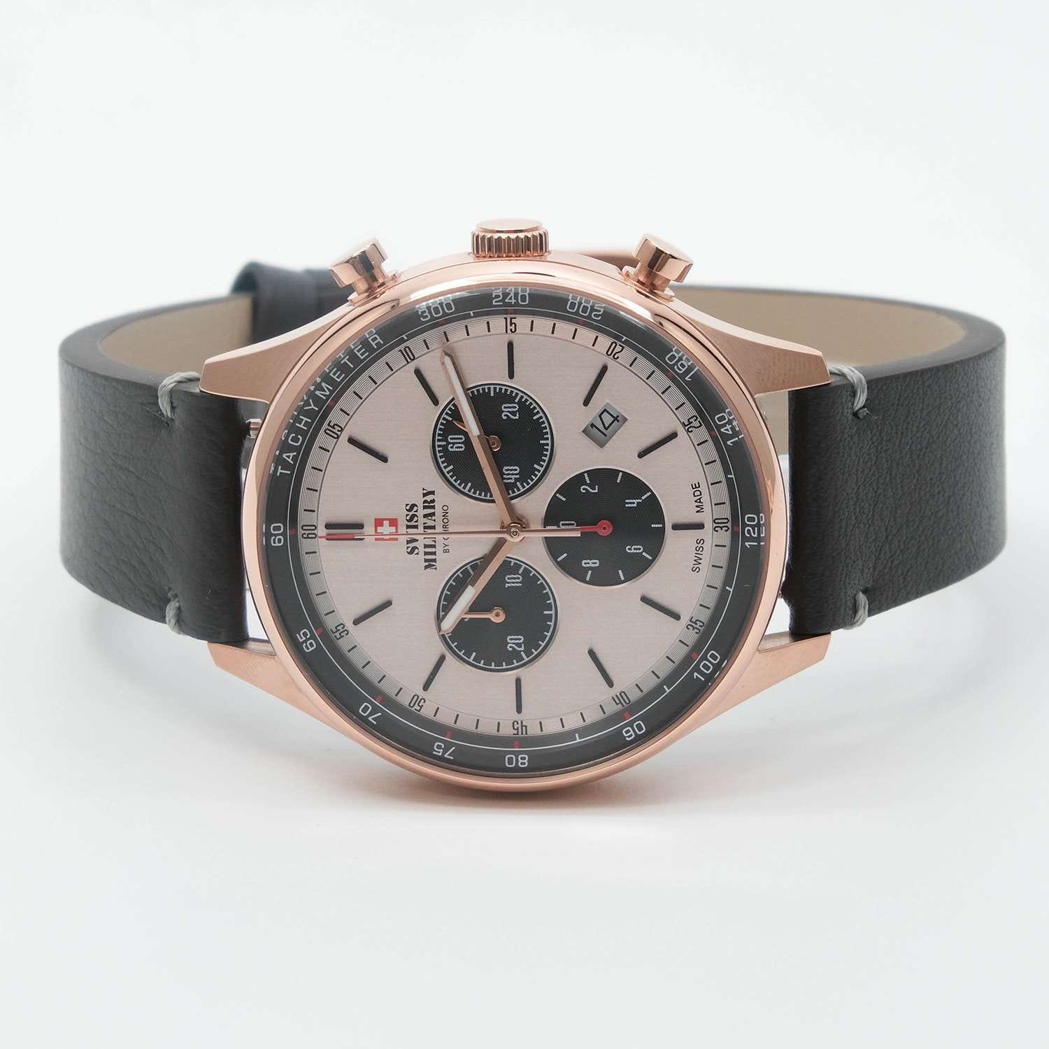 Мужские швейцарские наручные часы-хронографХронографФункция позволяет измерять отрезки времени с особой точностью: часы, минуты, секунды. Верным признаком хронографа является наличие на циферблате 3 дополнительных окошек-счётчиков. Swiss Military by Chrono SM34013.09, кварцевый механизм с высокой точностью. Класс водозащиты: 100 метров, позволит плавать, нырять и заниматься другими водными видами спорта. Стрелки с люминесцентным покрытиемЛюминесцентное покрытиеПозволяет считывать показания времени в темноте. Производители наносят на стрелки, часовые индексы, безель или поверхность циферблата светонакопительный состав, дающий холодное свечение.. Корпус часов изготовлен из стали с PVD-покрытиемPVDУльтратонкое покрытие наносится в технике вакуумного напыления, сочетает в себе нитрид титана особой прочности со слоем золота или оксида хрома. Несёт в себе декоративную или защитную функцию.. Минеральное стеклоМинеральное стеклоМинеральное стекло представляет собой искусственно выращенный минерал кварца. Такое стекло отличается особой устойчивостью к повреждениям и царапинам. Уступает по некоторым качествам сапфировому стеклу.. Ремешок с классической застежкой.