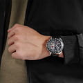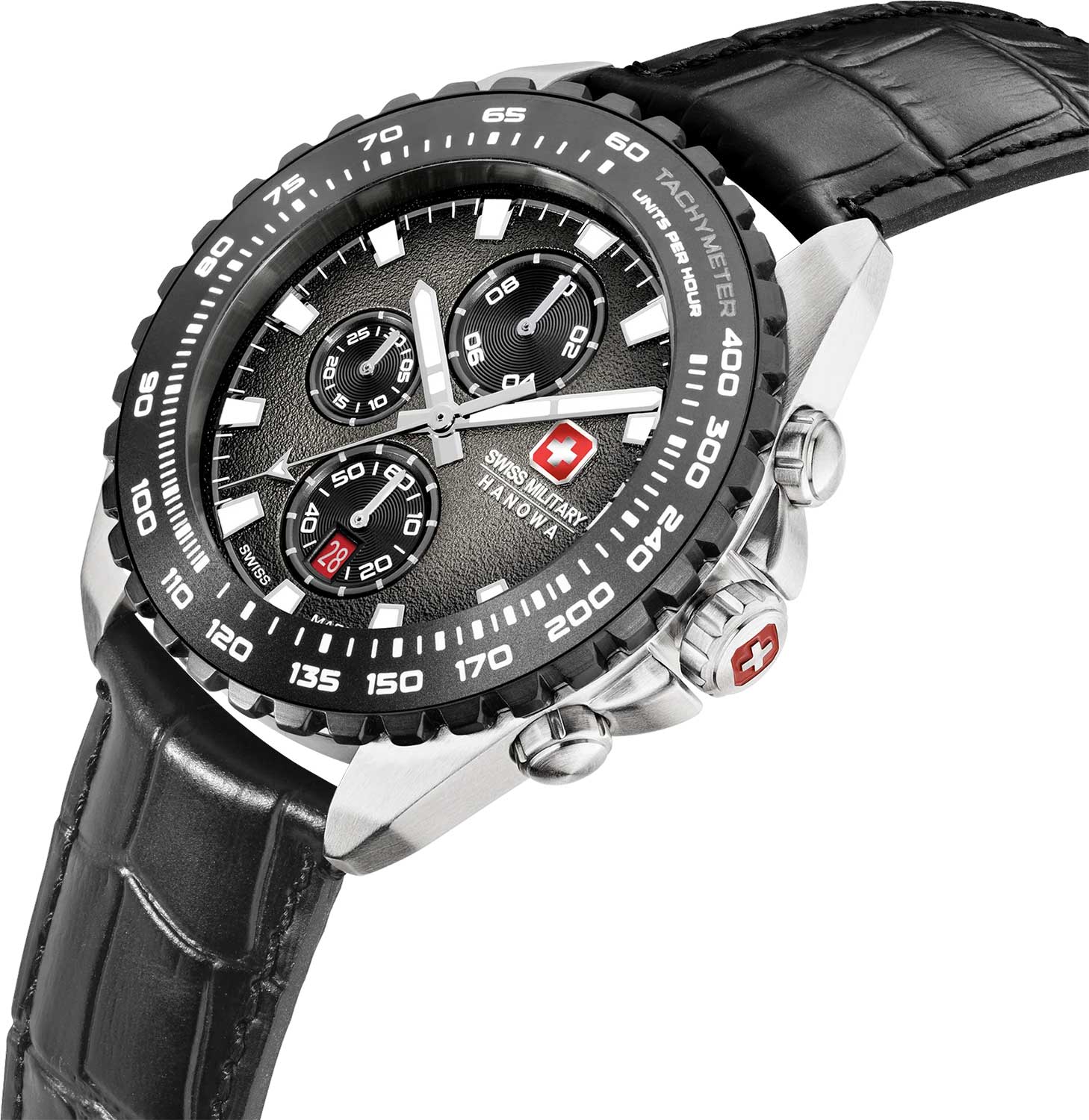 Мужские швейцарские часы- хронографХронографФункция позволяет измерять отрезки времени с особой точностью: часы, минуты, секунды. Верным признаком хронографа является наличие на циферблате 3 дополнительных окошек-счётчиков. с секундомеромСекундомерСекундоме́р — прибор, способный измерять интервалы времени с точностью до долей секунды. Swiss Military Hanowa Stone Marten SMWGC0001830, кварцевый механизм с высокой точностью. Сапфировое стеклоСапфировое стеклоПрочный и надёжный материал из кристалла сапфира синтетического происхождения, характеризующийся особой твёрдостью и устойчивостью к царапинам и повреждениям. устойчивое к появлению царапин, обладающее высокой прозрачностью. Корпус часов изготовлен из нержавеющей стали. Неподвижный безельБезельВнешний ободок, закрепляющий стекло. В спортивных часах так называется поворотное кольцо с делениями на циферблате, выполняет роль таймера – замеряет отрезки времени на шкале. Неподвижный безель – элемент декора. Однонаправленно вращающийся безель на дайверских часах позволяет фиксировать моменты погружения и выныривания на поверхность. из стали с IP-покрытиемIP-покрытиеМетод ионного напыления. Демонстрирует повышенную устойчивость к истиранию, окислению и химическим веществам. Под воздействием высокого давления и температуры около 1500°C молекулы металла надёжно соединяются с частицами корпуса часов. и шкалой тахиметрТахиметрРазмеченная шкала, располагается на ободке или безеле часов. Тахиметр позволяет рассчитать скорость на определённом участке пути, расстояние измеряется в километрах или милях.. Стрелки и метки с люминесцентным покрытиемЛюминесцентное покрытиеПозволяет считывать показания времени в темноте. Производители наносят на стрелки, часовые индексы, безель или поверхность циферблата светонакопительный состав, дающий холодное свечение.. Класс водозащиты: 100 метров, позволит плавать, нырять и заниматься другими водными видами спорта. Кожаный ремешок на стандартной застежке.