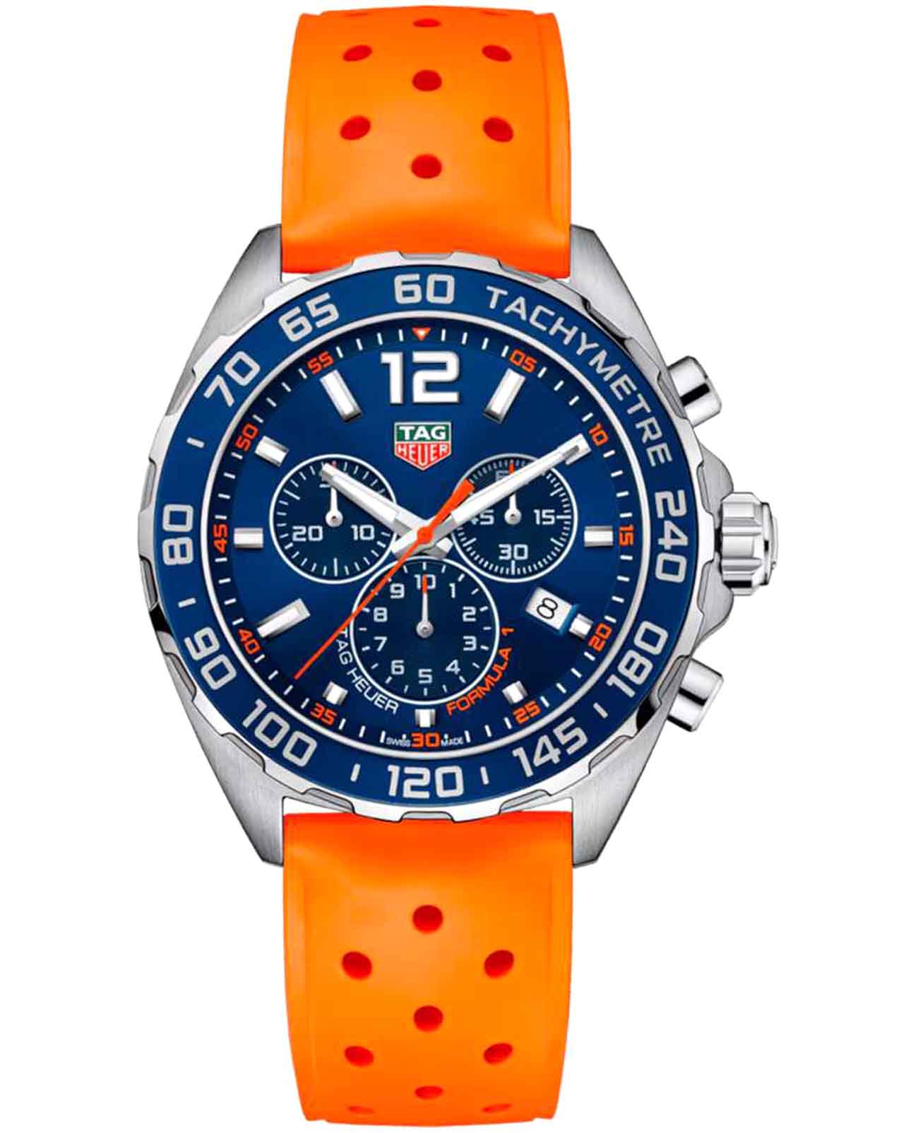Мужские кварцевые часы TAG Heuer Formula 1 Chronograph CAZ1014.FT8028 — это стильное сочетание элегантности и современного дизайна. Корпус из нержавеющей стали диаметром 43 мм идеально сбалансирован и элегантен. Сапфировое стеклоСапфировое стеклоПрочный и надёжный материал из кристалла сапфира синтетического происхождения, характеризующийся особой твёрдостью и устойчивостью к царапинам и повреждениям. с антибликовым покрытием защищает циферблат от царапин и обеспечивает отличную читаемость при любом освещении. Резиновый ремешок на стандартной застежке идеально дополняют дизайн часов, обеспечивая комфортное ношение. Стрелки и метки на циферблате имеют люминесцентное покрытиеЛюминесцентное покрытиеПозволяет считывать показания времени в темноте. Производители наносят на стрелки, часовые индексы, безель или поверхность циферблата светонакопительный состав, дающий холодное свечение. позволяющее легко определять время даже в темноте. БезельБезельВнешний ободок, закрепляющий стекло. В спортивных часах так называется поворотное кольцо с делениями на циферблате, выполняет роль таймера – замеряет отрезки времени на шкале. Неподвижный безель – элемент декора. Однонаправленно вращающийся безель на дайверских часах позволяет фиксировать моменты погружения и выныривания на поверхность. тахиметраТахиметрРазмеченная шкала, располагается на ободке или безеле часов. Тахиметр позволяет рассчитать скорость на определённом участке пути, расстояние измеряется в километрах или милях. подчёркивает спортивное наследие часов. Часы обладают впечатляющей водонепроницаемостью до 20 бар (200 метров), что делает их идеальными для плавания, ныряния и погружений с аквалангом. ХронографХронографФункция позволяет измерять отрезки времени с особой точностью: часы, минуты, секунды. Верным признаком хронографа является наличие на циферблате 3 дополнительных окошек-счётчиков. обеспечивает точное измерение времени на каждом круге. Прочная конструкция часов и высокопроизводительный механизм делают их идеальным спутником для любителей гонок.