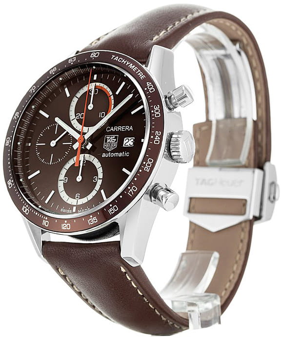 Наручные часы-хронографХронографФункция позволяет измерять отрезки времени с особой точностью: часы, минуты, секунды. Верным признаком хронографа является наличие на циферблате 3 дополнительных окошек-счётчиков. TAG Heuer Carrera CV2013.FC6234 олицетворяют собой спортивный стиль и высокие технологии. Механический механизм (автоматический калибр) CALIBRE 16 с высокой точностью производится целиком в стенах компании. Стальной корпус с тахиметрической шкалой, расположенной на безелеБезельВнешний ободок, закрепляющий стекло. В спортивных часах так называется поворотное кольцо с делениями на циферблате, выполняет роль таймера – замеряет отрезки времени на шкале. Неподвижный безель – элемент декора. Однонаправленно вращающийся безель на дайверских часах позволяет фиксировать моменты погружения и выныривания на поверхность. с частичным IP-покрытиемIP-покрытиеМетод ионного напыления. Демонстрирует повышенную устойчивость к истиранию, окислению и химическим веществам. Под воздействием высокого давления и температуры около 1500°C молекулы металла надёжно соединяются с частицами корпуса часов.. Диаметр часов 41 мм.Сапфировое стеклоСапфировое стеклоПрочный и надёжный материал из кристалла сапфира синтетического происхождения, характеризующийся особой твёрдостью и устойчивостью к царапинам и повреждениям. устойчивое к появлению царапин, обладающее высокой прозрачностью.Люминесцентная подсветкаЛюминесцентное покрытиеПозволяет считывать показания времени в темноте. Производители наносят на стрелки, часовые индексы, безель или поверхность циферблата светонакопительный состав, дающий холодное свечение. стрелок и меток на циферблате. Класс водозащиты: 100 метров, позволит плавать, нырять и заниматься другими водными видами спорта. Раскладная застёжкаРаскладная застёжкаТакой тип застёжки используется только на браслетах из металла. Она никогда не раскрывается полностью, происходит разделение на 2 и более частей. Раскладывающая застёжка снизит вероятность потери часов к минимуму.. Запас хода составляет 42 часов.