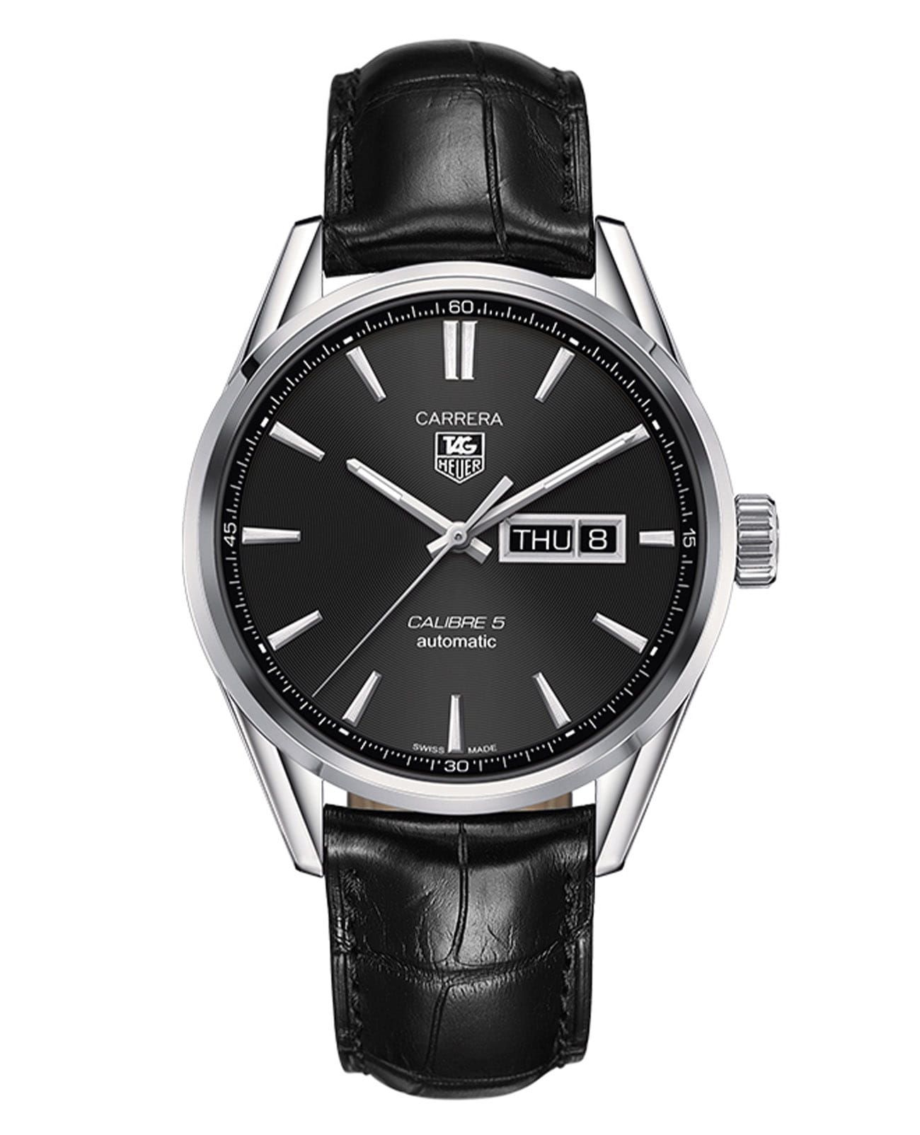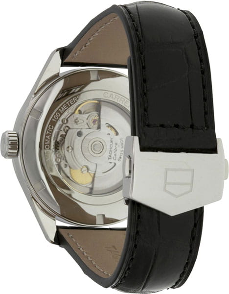 Элегантные часы TAG Heuer Carrera Calibre 5 Automatic Mens Black Leather Watch созданы для мужчин, которые ценят сдержанность и спортивный шик. Надежный и точный механизм Calibre 5 обладает запасом хода 38 часа. Узнаваемые вытянутые ушки стального корпуса, разметка, вынесенная на скошенный ободок циферблата, и архитектурный дизайн делают эту модель превосходным образцом элегантного стиля. Черный циферблат украшен объемным узором в виде расходящихся из центра концентрических кругов, что добавляет глубины и красивых переливов цвета. Часы оснащены не только функцией даты, но и дня недели, дополнительное окошко которого разместилось рядом с апертурой даты напротив отметки "3 часа". Черный ремешок из кожи аллигатора обеспечивает эргономичную посадку часов, а прочное сапфировое стекло защитит от царапин.
