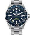 TAG Heuer Aquaracer WAY201B.BA0927 — стильные и надёжные часы, созданные для активного образа жизни и погружений. Корпус диаметром 43 мм выполнен из нержавеющей стали с матовой и полированной отделкой, что придаёт модели элегантный и динамичный вид. Однонаправленный вращающийся безельБезельВнешний ободок, закрепляющий стекло. В спортивных часах так называется поворотное кольцо с делениями на циферблате, выполняет роль таймера – замеряет отрезки времени на шкале. Неподвижный безель – элемент декора. Однонаправленно вращающийся безель на дайверских часах позволяет фиксировать моменты погружения и выныривания на поверхность. с керамической вставкой глубокого синего цвета оснащён минутной разметкой и светящимся маркером на позиции «12 часов», обеспечивая удобство при отсчёте времени погружения. Синий циферблат с горизонтальным гильоше дополнен накладными часовыми индексами и стрелками с люминесцентным покрытиемЛюминесцентное покрытиеПозволяет считывать показания времени в темноте. Производители наносят на стрелки, часовые индексы, безель или поверхность циферблата светонакопительный состав, дающий холодное свечение., что гарантирует превосходную читаемость в любых условиях освещения. Окошко даты с увеличительным стеклом расположено на отметке «3 часа» для удобства. Защиту циферблата обеспечивает сапфировое стеклоСапфировое стеклоПрочный и надёжный материал из кристалла сапфира синтетического происхождения, характеризующийся особой твёрдостью и устойчивостью к царапинам и повреждениям. с антибликовым покрытиемАнтибликовое покрытиеСлой оксида металла в 0,13-0,3 микрон, благодаря которому стекло часов не бликует и не отражает свет. Антибликовое покрытие уменьшает отражение света в 10 раз, обеспечивая отличную читаемость показателей циферблата.. Внутри установлен швейцарский автоматический механизм Calibre 5, обеспечивающий точность хода и запас энергии до 38 часов. Часы укомплектованы браслетом из нержавеющей стали с чередующейся полированной и матовой отделкой, а раскладная застёжкаРаскладная застёжкаТакой тип застёжки используется только на браслетах из металла. Она никогда не раскрывается полностью, происходит разделение на 2 и более частей. Раскладывающая застёжка снизит вероятность потери часов к минимуму. с двойной блокировкой и кнопками гарантирует надёжную фиксацию на запястье. Водонепроницаемость 300 метров делает модель идеальным выбором для занятий водными видами спорта, включая дайвинг.