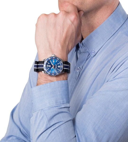 Мужские швейцарские наручные кварцевые часы TAG Heuer Formula 1 WAZ1010.FC8197. Сапфировое стеклоСапфировое стеклоПрочный и надёжный материал из кристалла сапфира синтетического происхождения, характеризующийся особой твёрдостью и устойчивостью к царапинам и повреждениям. устойчивое к появлению царапин, обладающее высокой прозрачностью. Стрелки и метки с люминесцентным покрытиемЛюминесцентное покрытиеПозволяет считывать показания времени в темноте. Производители наносят на стрелки, часовые индексы, безель или поверхность циферблата светонакопительный состав, дающий холодное свечение.. Класс водозащиты: 200 метров, позволит плавать, нырять и заниматься другими водными видами спорта. Корпус часов изготовлен из стали. Вращающийся стальной безельБезельВнешний ободок, закрепляющий стекло. В спортивных часах так называется поворотное кольцо с делениями на циферблате, выполняет роль таймера – замеряет отрезки времени на шкале. Неподвижный безель – элемент декора. Однонаправленно вращающийся безель на дайверских часах позволяет фиксировать моменты погружения и выныривания на поверхность. с PVD-покрытиемPVDУльтратонкое покрытие наносится в технике вакуумного напыления, сочетает в себе нитрид титана особой прочности со слоем золота или оксида хрома. Несёт в себе декоративную или защитную функцию.. Тканевый ремешок на стандартной застёжке. Окошко даты находится в положении 3 часа.