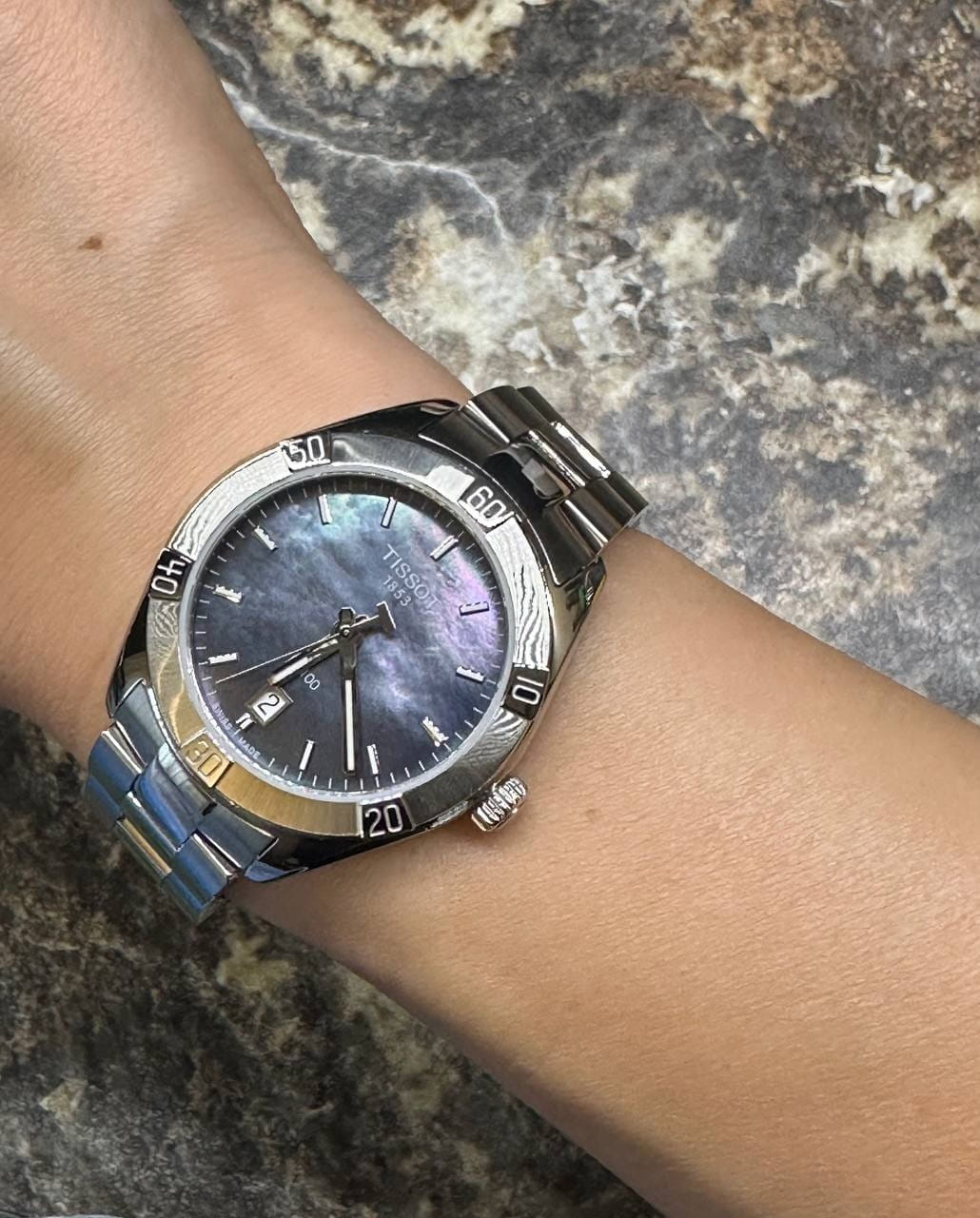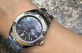 В оригинальный циферблат невозможно не влюбиться - переливающийся сине-чёрный перламутр заставляет задуматься о неизведанных морских глубинах или космических пространствах.  Компактный стальной корпус. Кварцевый высокоточный механизм ETA 955.412. Прочное сапфировое стекло. Водонепроницаемость до 10 бар. Апертура даты. Функция уведомления о необходимости замены элемента питания. Габариты: 36 x 36 x 9 мм.