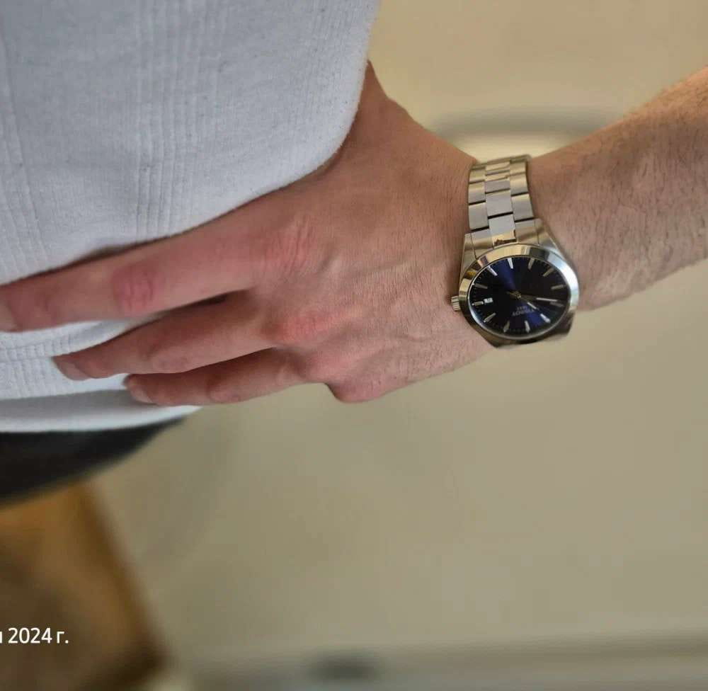 Стильный аксессуар в классическом стиле поможет всегда находиться на высоте. Минималистичный синий циферблат, дополненный серебристыми стрелками и часовыми метками, всегда будет актуальным. Часы работают благодаря кварцевому механизму ETA F06.115 с высокой точностью хода. Люминесцентная подсветкаЛюминесцентное покрытиеПозволяет считывать показания времени в темноте. Производители наносят на стрелки, часовые индексы, безель или поверхность циферблата светонакопительный состав, дающий холодное свечение.. Сапфировое стекло препятствует появлению царапин. Водонепроницаемость до 10 бар. Отображение даты, EOLEOLПредставляет собой систему, уведомляющую владельца часов о необходимости замены элемента питания. За 2 недели до полного разряда батарейки секундная стрелка перестаёт ходить чётко и начинает перепрыгивать на 3-4 деления.. Габариты: 40 x 40 x 8,52 мм.