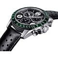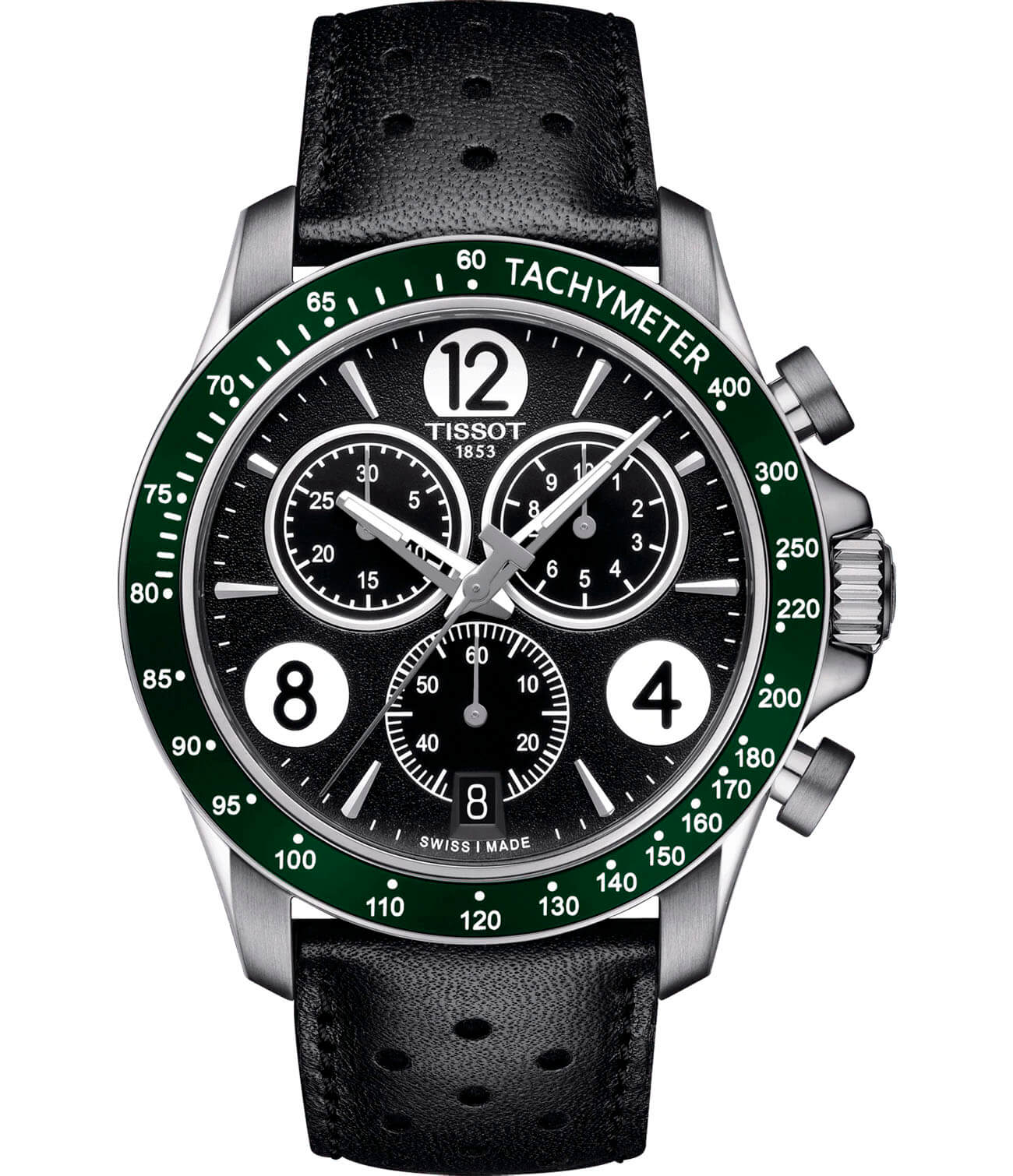 Брендовый хронографХронографФункция позволяет измерять отрезки времени с особой точностью: часы, минуты, секунды. Верным признаком хронографа является наличие на циферблате 3 дополнительных окошек-счётчиков. будет великолепным дополнением к любой одежде. Его привлекательность заключается в лаконичном дизайне, динамичных элементах, винтажных деталях. Циферблат чёрного цвета с номерами, напоминающими те, с которыми выступают гонщики, имеет арабские цифры, что обеспечивает идеальную читаемость показаний времени. Кварцевый высокоточный механизм ETA G10.212. Стекло из сапфира. Водонепроницаемость при давлении 10 бар. БезельБезельВнешний ободок, закрепляющий стекло. В спортивных часах так называется поворотное кольцо с делениями на циферблате, выполняет роль таймера – замеряет отрезки времени на шкале. Неподвижный безель – элемент декора. Однонаправленно вращающийся безель на дайверских часах позволяет фиксировать моменты погружения и выныривания на поверхность. со шкалой тахиметраТахиметрРазмеченная шкала, располагается на ободке или безеле часов. Тахиметр позволяет рассчитать скорость на определённом участке пути, расстояние измеряется в километрах или милях. и зелёным PVD-покрытиемPVDУльтратонкое покрытие наносится в технике вакуумного напыления, сочетает в себе нитрид титана особой прочности со слоем золота или оксида хрома. Несёт в себе декоративную или защитную функцию.. Ремешок из натуральной кожи с перфорацией. Люминесцентная подсветкаЛюминесцентное покрытиеПозволяет считывать показания времени в темноте. Производители наносят на стрелки, часовые индексы, безель или поверхность циферблата светонакопительный состав, дающий холодное свечение.. Секундомер, индикация текущего числа. Габариты: 42,5 x 42,5 x 11,2 мм.