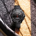 Модель оснащена сапфировым сенсорным стеклом. В основе работы часов находится ПО Swiss Autonomous Low Power System (SwALPS) со сверхнизким потреблением энергии. За счёт технологии аксессуар получил увеличенное до 6 месяцев время работы без необходимости подзарядки. Швейцарский кварцевый механизм ETA E32.001 отличается высокой точностью хода. Корпус выполнен из титана с PVD-покрытиемPVDУльтратонкое покрытие наносится в технике вакуумного напыления, сочетает в себе нитрид титана особой прочности со слоем золота или оксида хрома. Несёт в себе декоративную или защитную функцию., безельБезельВнешний ободок, закрепляющий стекло. В спортивных часах так называется поворотное кольцо с делениями на циферблате, выполняет роль таймера – замеряет отрезки времени на шкале. Неподвижный безель – элемент декора. Однонаправленно вращающийся безель на дайверских часах позволяет фиксировать моменты погружения и выныривания на поверхность. из керамики, ремешок изготовлен из каучука. Функции: будильник, хронографХронографФункция позволяет измерять отрезки времени с особой точностью: часы, минуты, секунды. Верным признаком хронографа является наличие на циферблате 3 дополнительных окошек-счётчиков., барометр, метеопрогноз, высотомер.