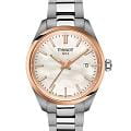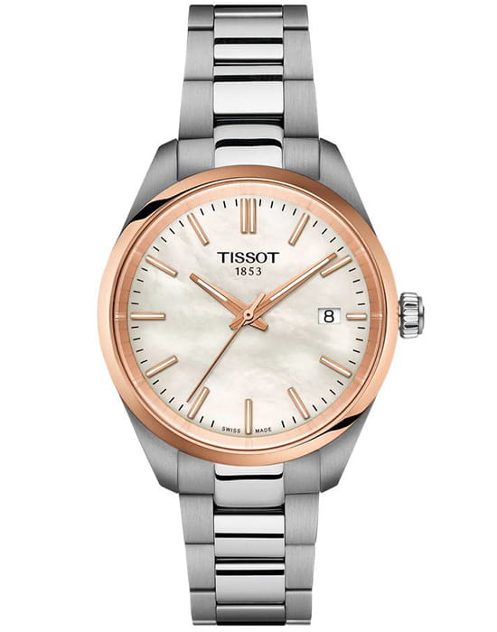 Tissot PR 100 34mm— изысканные женские швейцарские часы, созданные в элегантном классическом стиле. Корпус диаметром 34 мм выполнен из нержавеющей стали и украшен PVDPVDУльтратонкое покрытие наносится в технике вакуумного напыления, сочетает в себе нитрид титана особой прочности со слоем золота или оксида хрома. Несёт в себе декоративную или защитную функцию.-покрытием тёплого розового оттенка на безелеБезельВнешний ободок, закрепляющий стекло. В спортивных часах так называется поворотное кольцо с делениями на циферблате, выполняет роль таймера – замеряет отрезки времени на шкале. Неподвижный безель – элемент декора. Однонаправленно вращающийся безель на дайверских часах позволяет фиксировать моменты погружения и выныривания на поверхность., что придаёт образу благородство и утончённость. Серебристый циферблат с изящным солнечным узором оснащён аккуратными метками и стрелками в тон, а также практичным окошком даты на «3 часах». За надёжность отвечает швейцарский кварцевый механизм, гарантирующий точность хода. Модель защищена сапфировым стекломСапфировое стеклоПрочный и надёжный материал из кристалла сапфира синтетического происхождения, характеризующийся особой твёрдостью и устойчивостью к царапинам и повреждениям., устойчивым к царапинам, и укомплектована прочным стальным браслетом на застёжке-бабочке с кнопкамиЗастёжка "бабочка"Такой вид застёжки дополняется предохранителями, помогающими избежать случайного раскрытия браслета. Обладают изящным исполнением. , обеспечивающей комфортное ношение.