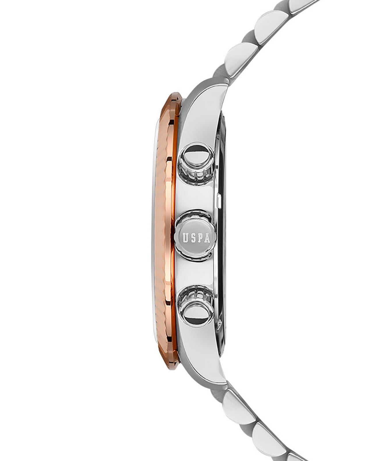 Мужские часы U.S. Polo Assn. Crossing USPA1054-04, кварцевый механизм с высокой точностью. Минеральное стеклоМинеральное стеклоМинеральное стекло представляет собой искусственно выращенный минерал кварца. Такое стекло отличается особой устойчивостью к повреждениям и царапинам. Уступает по некоторым качествам сапфировому стеклу. устойчивое к появлению царапин, обладающее высокой прозрачностью. Корпус изготовлен из нержавеющей стали. БезельБезельВнешний ободок, закрепляющий стекло. В спортивных часах так называется поворотное кольцо с делениями на циферблате, выполняет роль таймера – замеряет отрезки времени на шкале. Неподвижный безель – элемент декора. Однонаправленно вращающийся безель на дайверских часах позволяет фиксировать моменты погружения и выныривания на поверхность. с IP-покрытиемIP-покрытиеМетод ионного напыления. Демонстрирует повышенную устойчивость к истиранию, окислению и химическим веществам. Под воздействием высокого давления и температуры около 1500°C молекулы металла надёжно соединяются с частицами корпуса часов.. Центральные часовая, минутная и секундная стрелки. Индикация даты и дня недели. 12/24х часовой формат времени. Стрелки с люминесцентным покрытиемЛюминесцентное покрытиеПозволяет считывать показания времени в темноте. Производители наносят на стрелки, часовые индексы, безель или поверхность циферблата светонакопительный состав, дающий холодное свечение.. Класс водозащиты: 50 метров, позволит защитить корпус от случайных брызг или капель дождя. Стальной браслет с частичным IP-покрытиемIP-покрытиеМетод ионного напыления. Демонстрирует повышенную устойчивость к истиранию, окислению и химическим веществам. Под воздействием высокого давления и температуры около 1500°C молекулы металла надёжно соединяются с частицами корпуса часов. на раскладной застёжкеРаскладная застёжкаТакой тип застёжки используется только на браслетах из металла. Она никогда не раскрывается полностью, происходит разделение на 2 и более частей. Раскладывающая застёжка снизит вероятность потери часов к минимуму..