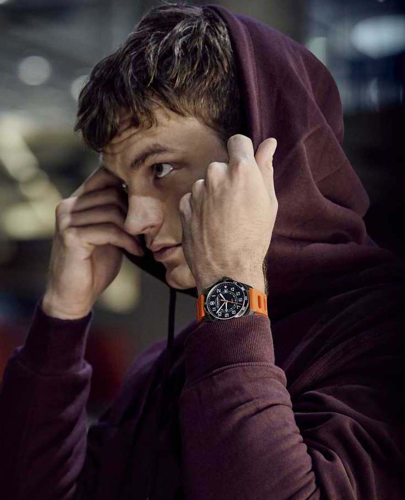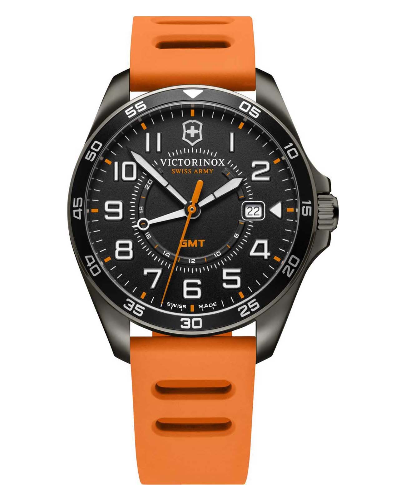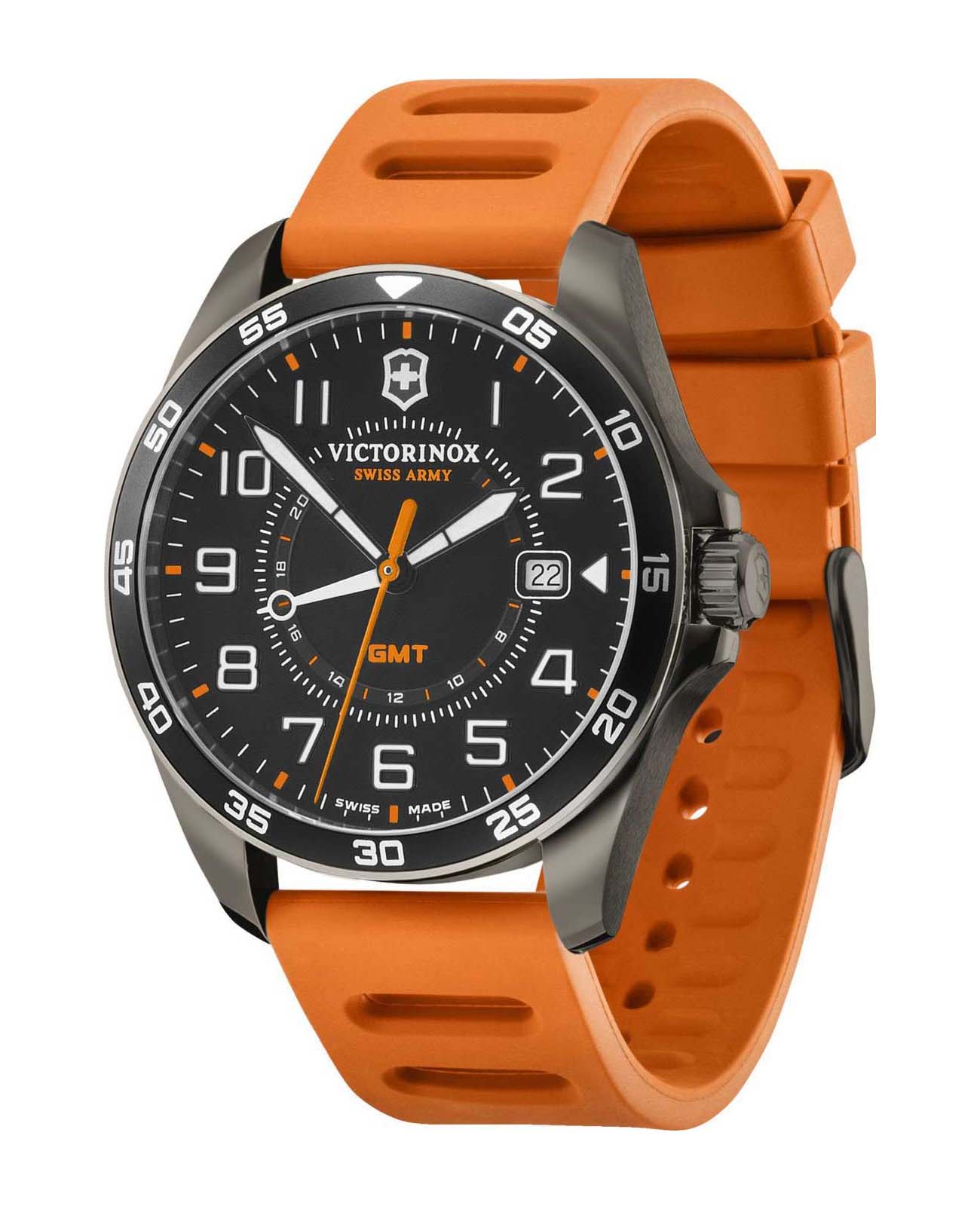 Мужские швейцарские часы-хронографХронографФункция позволяет измерять отрезки времени с особой точностью: часы, минуты, секунды. Верным признаком хронографа является наличие на циферблате 3 дополнительных окошек-счётчиков. Victorinox Fieldforce Sport Chronograph 241897  с надёжным кварцевым механизмом. Сапфировое стеклоСапфировое стеклоПрочный и надёжный материал из кристалла сапфира синтетического происхождения, характеризующийся особой твёрдостью и устойчивостью к царапинам и повреждениям. с трёхслойным антибликовым покрытием. Корпус часов выполнен из нержавеющей стали с PVD-покрытиемPVDУльтратонкое покрытие наносится в технике вакуумного напыления, сочетает в себе нитрид титана особой прочности со слоем золота или оксида хрома. Несёт в себе декоративную или защитную функцию.. Второй часовой пояс в 24-х часовом формате времени отображается дополнительной центральной стрелкой. Окошко даты находится в положении 3 часов, стрелки и метки с люминесцентным покрытиемЛюминесцентное покрытиеПозволяет считывать показания времени в темноте. Производители наносят на стрелки, часовые индексы, безель или поверхность циферблата светонакопительный состав, дающий холодное свечение.. Класс водозащиты: 100 метров, позволит плавать, нырять и заниматься другими водными видами спорта. Практичный резиновый ремешок на стандартной застёжке.