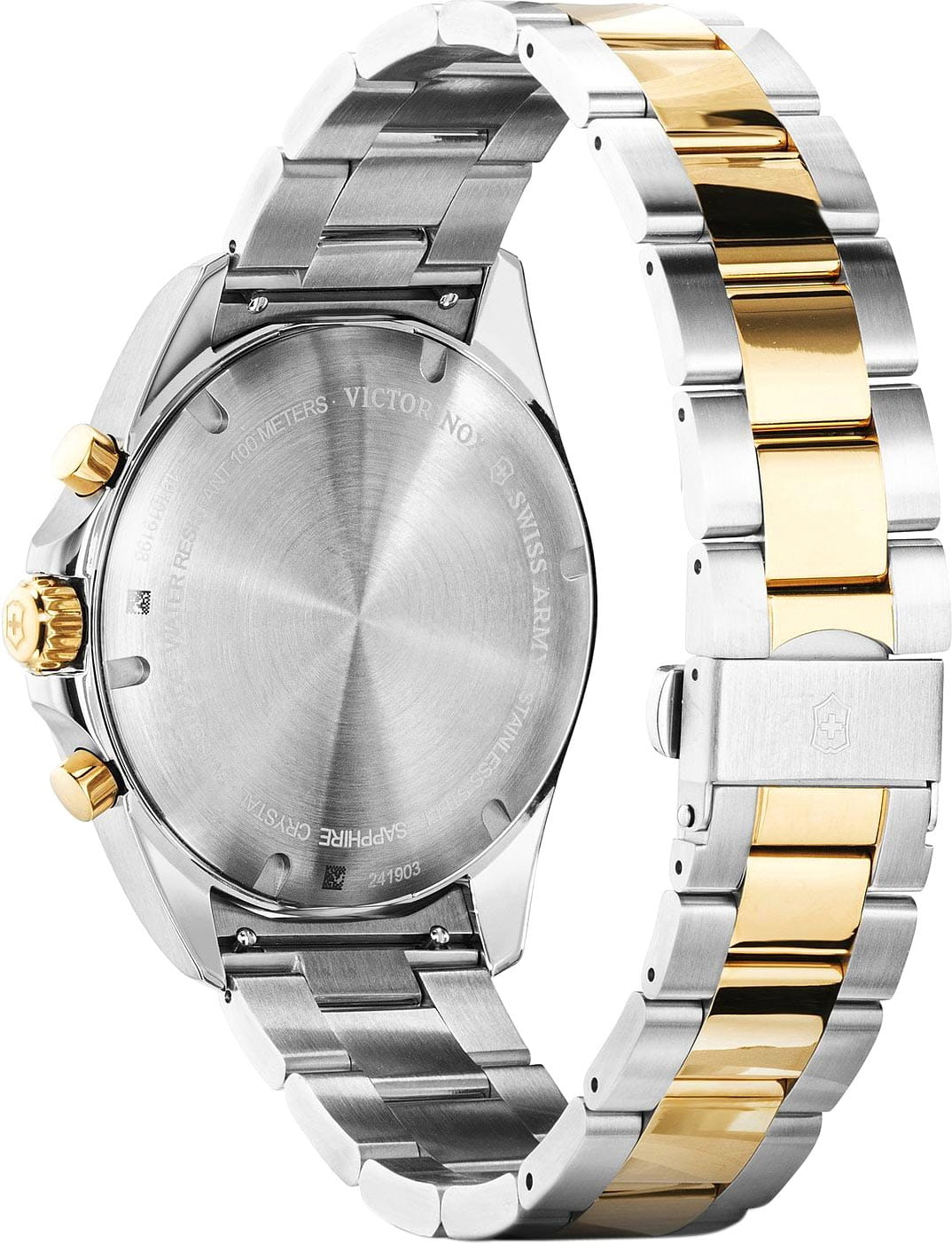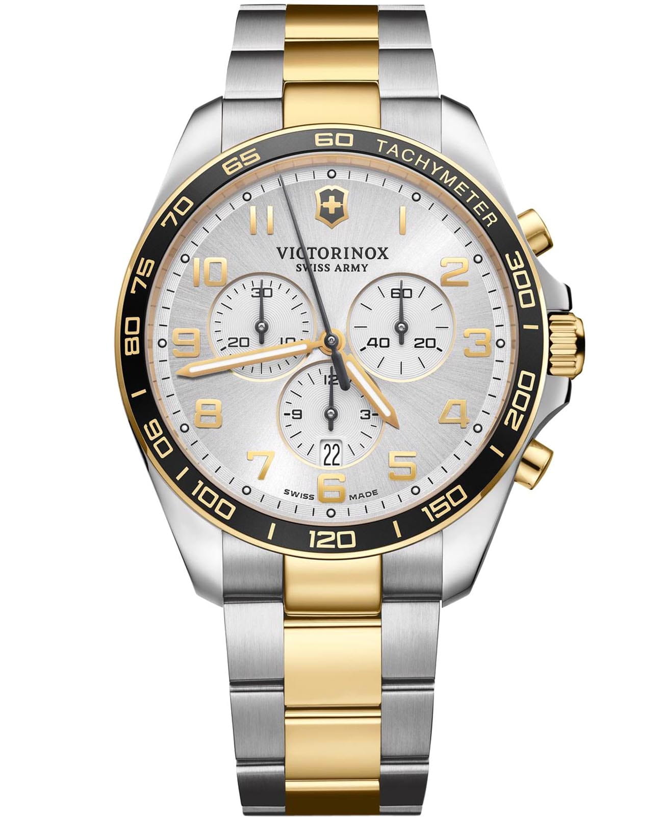 Мужские швейцарские часы-хронографХронографФункция позволяет измерять отрезки времени с особой точностью: часы, минуты, секунды. Верным признаком хронографа является наличие на циферблате 3 дополнительных окошек-счётчиков. Victorinox Fieldforce Chronograph 241903 с надёжным кварцевым механизмом. Сапфировое стеклоСапфировое стеклоПрочный и надёжный материал из кристалла сапфира синтетического происхождения, характеризующийся особой твёрдостью и устойчивостью к царапинам и повреждениям. с трёхслойным антибликовым покрытием. Корпус часов выполнен из нержавеющей стали 316L. Стальной браслет с частичным PVD-покрытиемPVDУльтратонкое покрытие наносится в технике вакуумного напыления, сочетает в себе нитрид титана особой прочности со слоем золота или оксида хрома. Несёт в себе декоративную или защитную функцию. на раскладной застёжкеРаскладная застёжкаТакой тип застёжки используется только на браслетах из металла. Она никогда не раскрывается полностью, происходит разделение на 2 и более частей. Раскладывающая застёжка снизит вероятность потери часов к минимуму.. Влагозащита: 100 метров, позволит плавать, нырять и заниматься другими водными видами спорта. Окошко даты находится в положении 6 часов, стрелки и метки с люминесцентным покрытиемЛюминесцентное покрытиеПозволяет считывать показания времени в темноте. Производители наносят на стрелки, часовые индексы, безель или поверхность циферблата светонакопительный состав, дающий холодное свечение., тахиметрТахиметрРазмеченная шкала, располагается на ободке или безеле часов. Тахиметр позволяет рассчитать скорость на определённом участке пути, расстояние измеряется в километрах или милях..