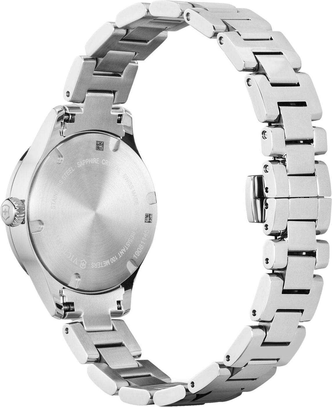 Женские часы Victorinox ALLIANCE XS 241916 с надёжным кварцевым механизмом. Корпус выполнен из нержавеющей стали. Стальной браслет на застёжке-бабочке с кнопкамиЗастёжка "бабочка"Такой вид застёжки дополняется предохранителями, помогающими избежать случайного раскрытия браслета. Обладают изящным исполнением. . Циферблат инкрустирован кристаллами Swarovski. Стрелки и метки с люминесцентным покрытиемЛюминесцентное покрытиеПозволяет считывать показания времени в темноте. Производители наносят на стрелки, часовые индексы, безель или поверхность циферблата светонакопительный состав, дающий холодное свечение.. Уровень влагозащиты: 100 метров, позволит плавать, нырять и заниматься другими водными видами спорта.