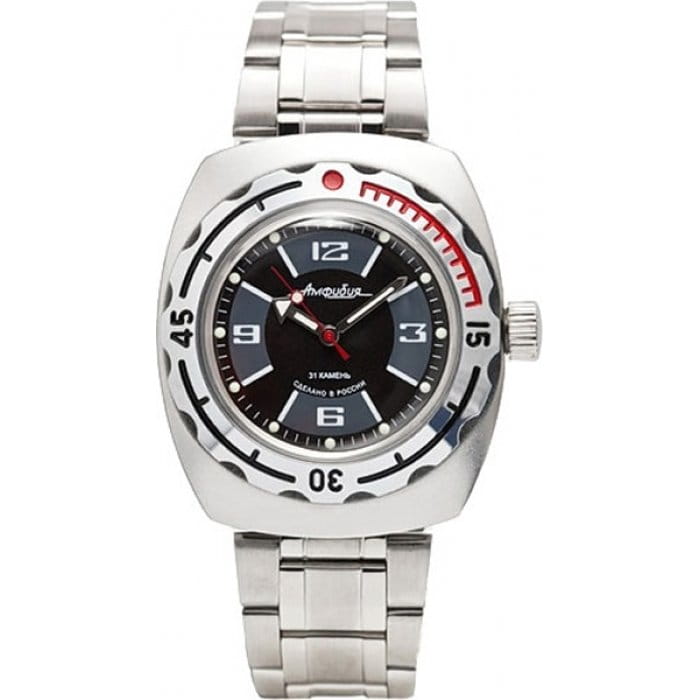 Эти практичные часы великолепно сидят на руке и позволят вам чувствовать себя уверенно в любой обстановке. Амфибия Классика. В механизме 31 камень, частота 19800 полуколебаний в час. Запас хода 31 час. Противоударное устройство оси баланса. Браслет с раскладывающейся застежкой.