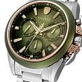 Швейцарские мужские кварцевые часы-хронограф Wainer WA.16100-A с механизмом калибра Ronda 5030.D станут идеальным выбором для ценителей стильных и практичных аксессуаров. Корпус из нержавеющей стали 316L с частичным PVD-покрытиемPVDУльтратонкое покрытие наносится в технике вакуумного напыления, сочетает в себе нитрид титана особой прочности со слоем золота или оксида хрома. Несёт в себе декоративную или защитную функцию. диаметром 44 мм и толщиной 11 мм защищен прочным сапфировым стекломСапфировое стеклоПрочный и надёжный материал из кристалла сапфира синтетического происхождения, характеризующийся особой твёрдостью и устойчивостью к царапинам и повреждениям., устойчивым к царапинам и механическим повреждениям. Зеленый циферблат с метками в виде штрихов оснащен окошком даты между 4 и 5 часами, а указатель дня недели вынесен на отдельный циферблат. Рифленая заводная головка с защитой обеспечивает дополнительную надежность механизма. Модель имеет класс водозащиты 100 метров, позволит плавать, нырять и заниматься другими водными видами спорта. Часы комплектуются стальным браслетом из нержавеющей стали 316L на раскладной застёжкеРаскладная застёжкаТакой тип застёжки используется только на браслетах из металла. Она никогда не раскрывается полностью, происходит разделение на 2 и более частей. Раскладывающая застёжка снизит вероятность потери часов к минимуму.. Функциональные возможности включают хронограф, секундомер и вынесенную секундную стрелку. Модель станет превосходным выбором для мужчин, ценящих надежность швейцарского качества и современный дизайн.